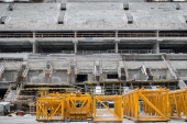 В настоящий момент на стадионе идет завершающий этап бетонных работ, который должен завершиться в начале следующего года. Все секторы, за исключением G (сектор над мостом) находятся в степени готовности от 80 до 100%. Подрядчики начали монтаж пилонов — опор, которые будут удерживать конструкцию кровли. А также застелили поле бетонными плитами, чтобы тяжёлые краны и механизмы не продавливали фундамент. Сейчас на площадке собирают кран грузоподъёмностью 750 тонн, с которого на 50-метровую высоту будут подниматься тяжёлые металлоконструкции крыши.