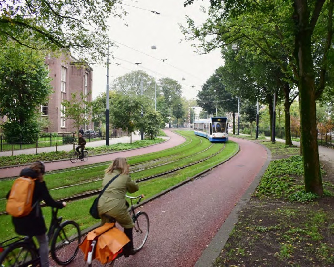 Если по улице ходит трамвай или другой магистральный транспорт, то для движения машин можно закрыть один квартал – общественный транспорт выиграет в скорости по сравнению с машиной, что привлечет новых пассажиров. Кроме того, снизится транспортная нагрузка на улицу без потери провозной способности. На фото Амстердам, раньше на месте велодорожек и газона были полосы для машин.
