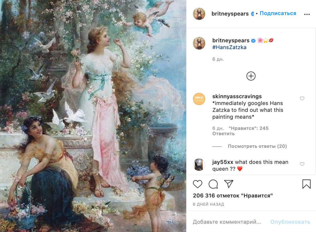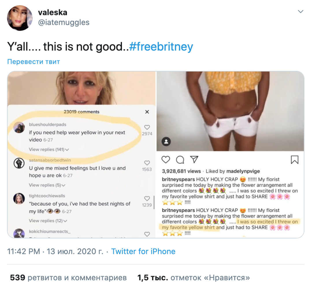 Во время карантина в аккаунте певицы стали появляться танцевальные видео, селфи и загадочные цитаты. Фанаты обеспокоились психическим состоянием Спирс и решили, что публикации - это скрытые просьбы о помощи. В результате, в комментариях Спирс просили “надеть желтое” или “запостить голубей”, если ей нужна помощь. И, как утверждают фанаты, она выполнила их просьбы.