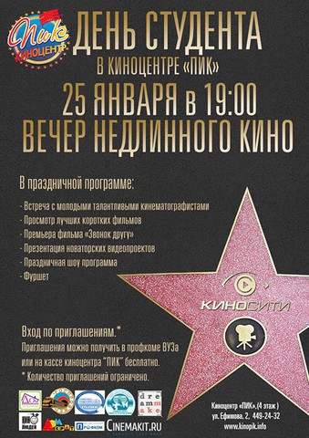25 января в киноцентре “Пик” пройдет приуроченный ко дню студента “Вечер недлинного кино”. В программе - показы студенческого короткого метра, встречи с молодыми режиссерами, шоу-программа и фуршет.
