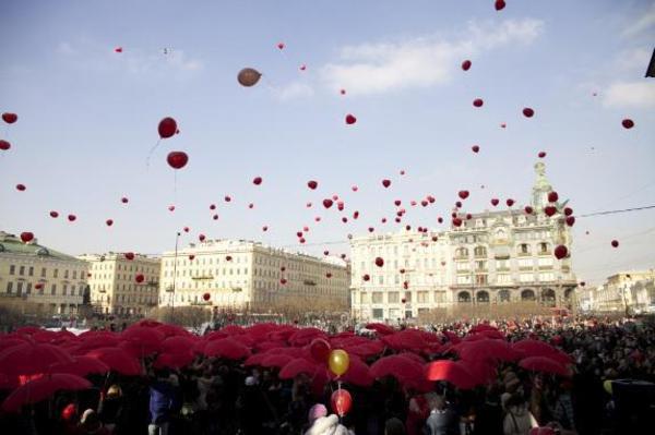 Участники романтического арт-моба «Сердце города», прошедшем в Санкт-Петербурге 8 марта при поддержке соков и нектаров «Любимый», создали огромный «живой» арт-объект, который могли зафиксировать даже спутники. 300 борцов за искренность в отношениях взяли в руки красные зонты и выстроились в фигуру сердца. Всего в акции приняли участие более 2 тыс. человек.