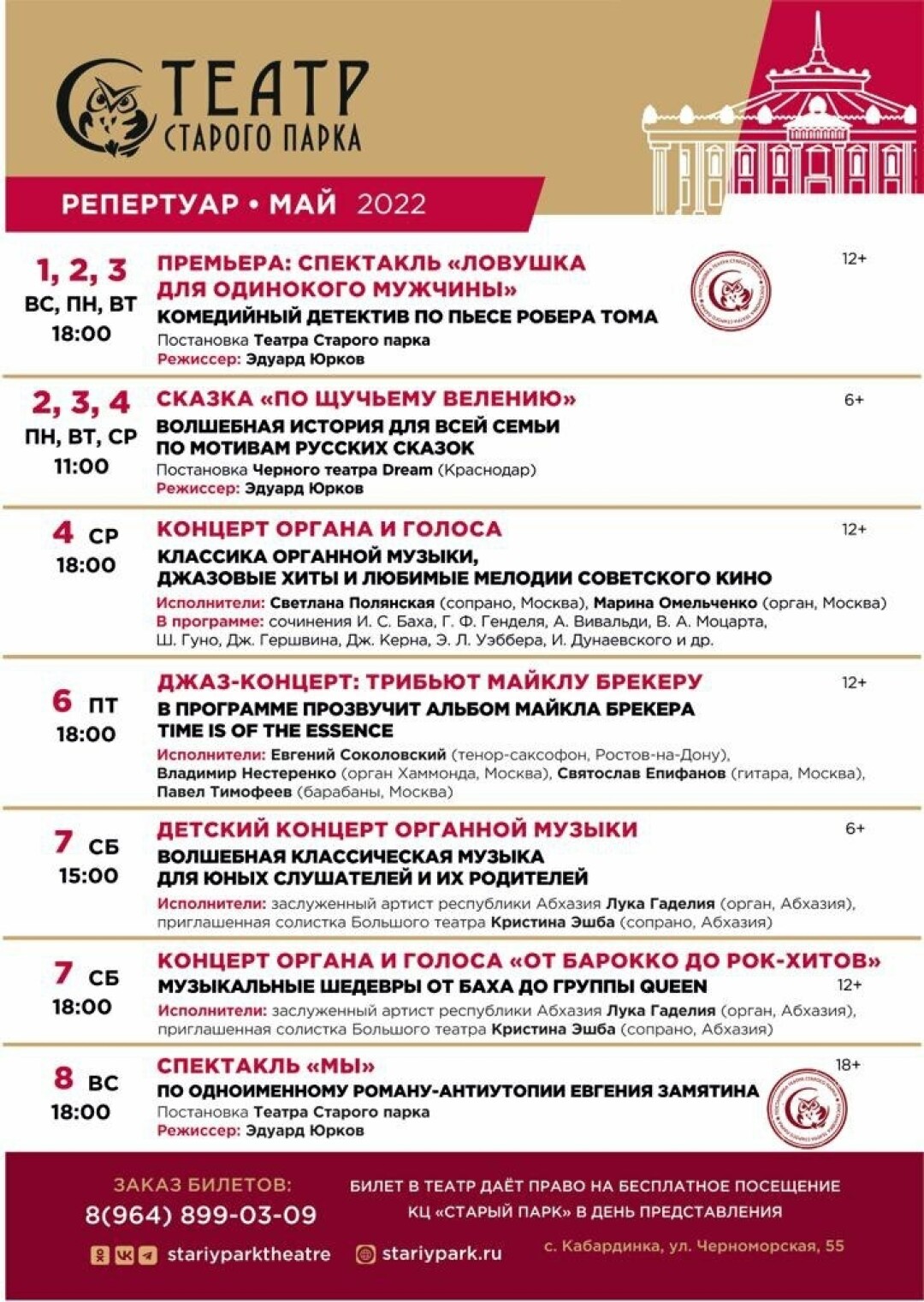 В марте этого года стало известно, что уже хорошо известный театралам побережья театр культурного центра «Старый парк» собрал труппу, художественным руководителем которой назначен режиссер и актер Эдуард Юрков. Именно он выступил инициатором постановки такого непростого произведения, как роман Замятина. История рассказывает о событиях далекого будущего, где на место индивидуального пришло общее, чувства вытесняются разумом, а счастье больше не дело отдельной личности, но задача государства. Спектакль, как и роман, исследует весьма непростые социальные и общечеловеческие вопросы и приглашает зрителя задуматься, какой путь выбирает лично он. Уже 1, 2 и 3 мая Театр Старого парка покажет свою вторую работу – на этот раз совершенно в другом жанре. Зрители увидят комедийный детектив «Ловушка для одинокого мужчины» по пьесе французского драматурга Робера Тома.