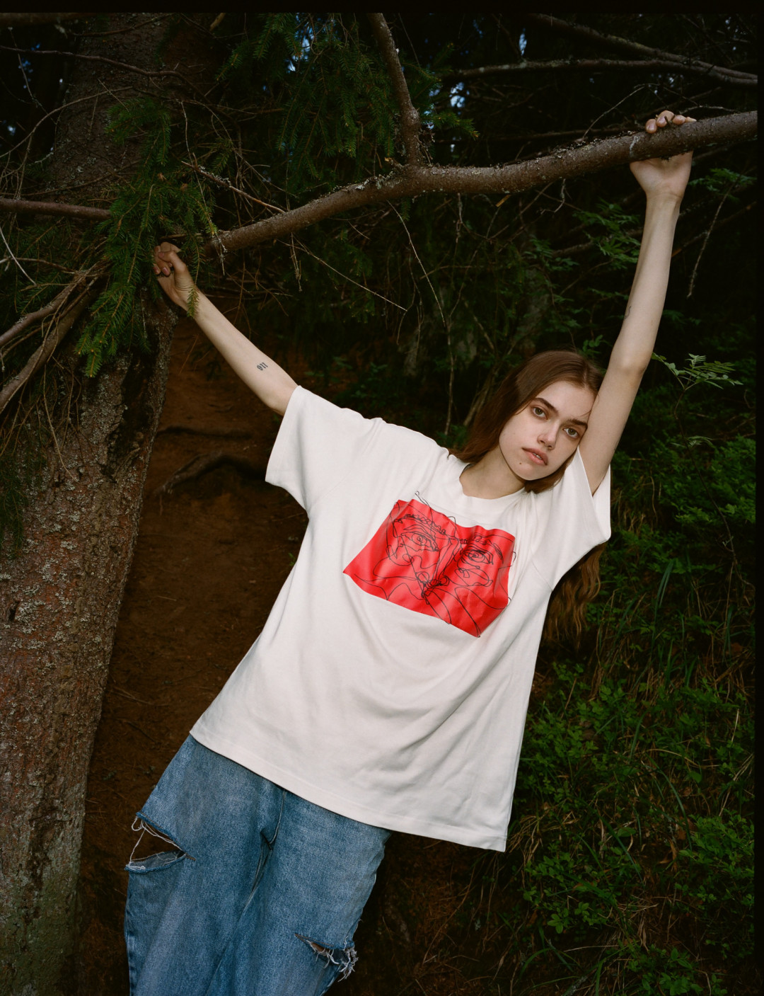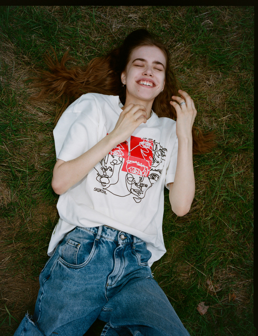 В линейку вошли две футболки с рисунками авторства российской модели, художницы и героини нашей декабрьской обложки. Для создания принтов Скокова использовала логотип 404 Not Found, который вписала в свои работы.