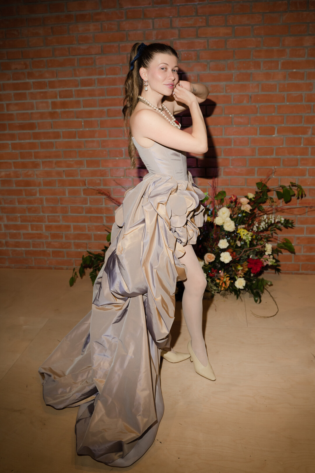 «Сегодня я выбрала такой немного свадебно-плэйфул образ из кутюрной коллекции Tatyana Kochnova. Все скроено вручную, украшено страусиными перьями и цветами. В эпоху турбулентности хотелось чего-то мягкого, зефирного, нежного, а не брутального.