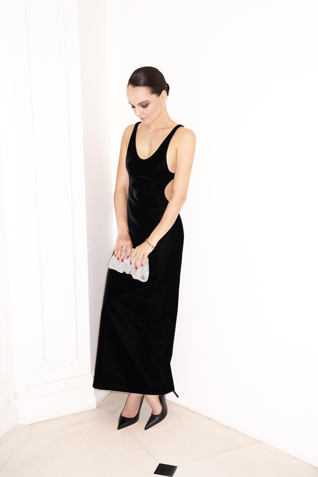 Платье Saint Laurent, туфли Tom Ford, серьги, колье и браслет Mercury, клатч Benedetta Bruzziches (все — ДЛТ)