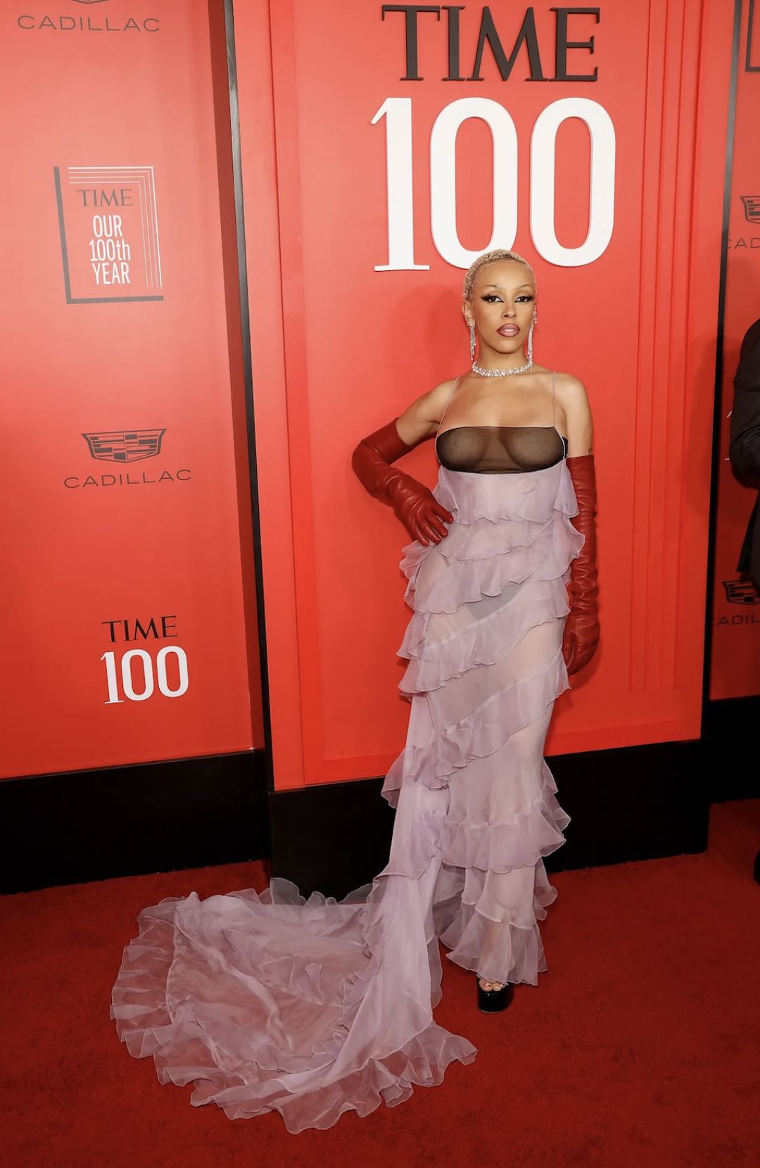 Приз нашей редакции за самый элегантный образ на ужине получает Кайя Гербер в монохромном платье с открытой спиной Khaite. А за самый голый– Doja Cat в полупрозрачном луке Valentino с красными перчатками.
