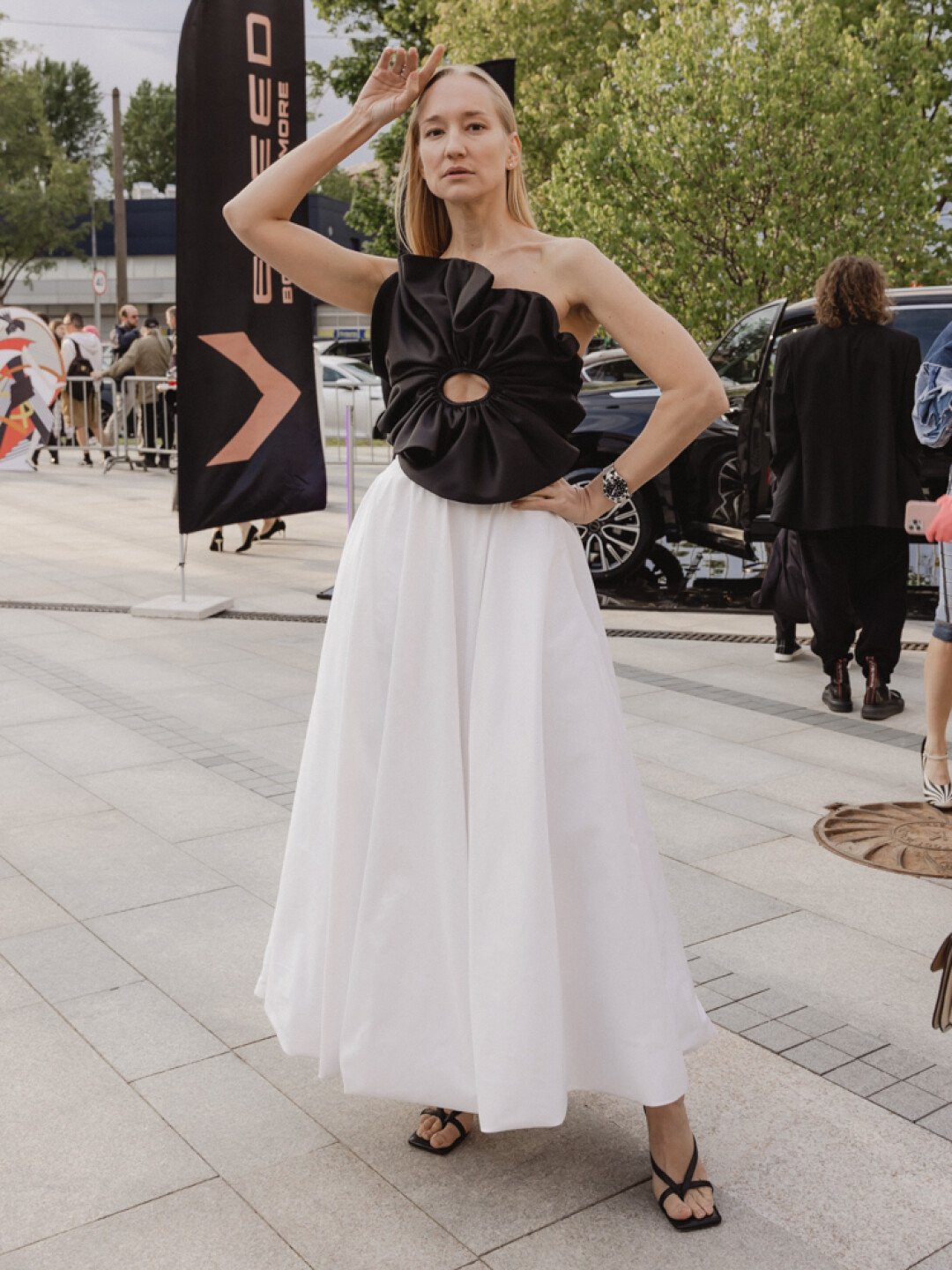 Чем импортозамещаете ушедшие бренды: Я проехала со своим актерским тренингом по всей России, и нашла потрясающий бренд в Барнауле – ANNASOPOVA. Вот ее очень трендовая белая юбка баллон и топ-цветок. К сожалению, Анна несколько дней назад умерла от тяжелой болезни, но красота, которую она создавала, живет.