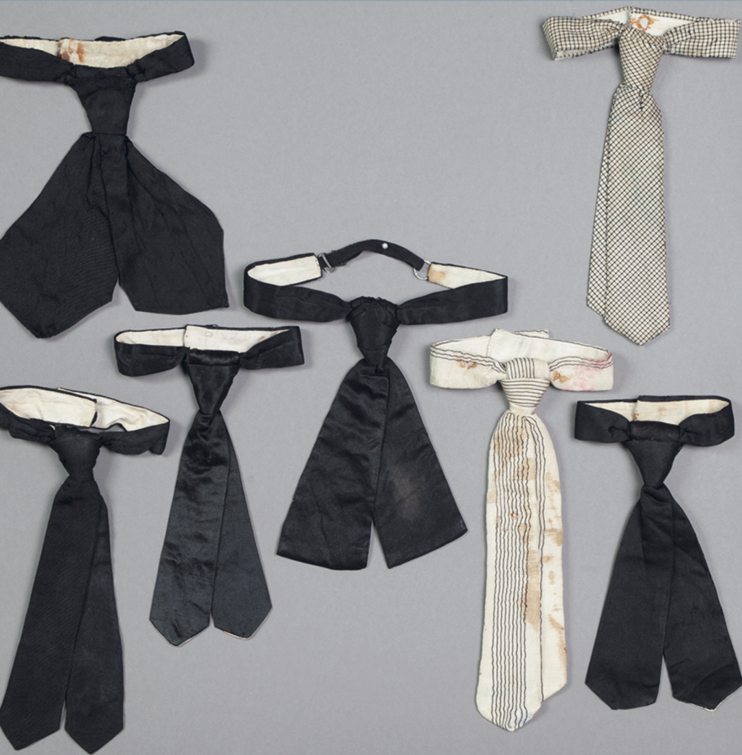 Галстуки московского врача И. В. Фомина, начало ХХ в., слева направо: галстук-бабочка, Западная Европа (?); галстук-бабочка, комбинированный с манишкой, Западная Европа (?); галстук форменный, для учащихся или служащих