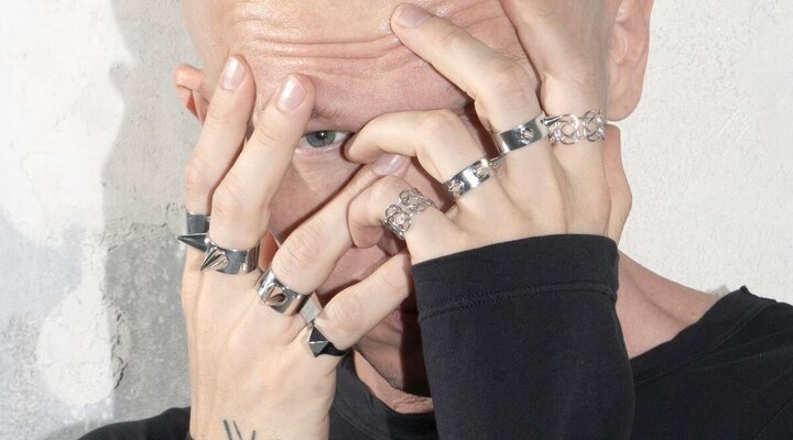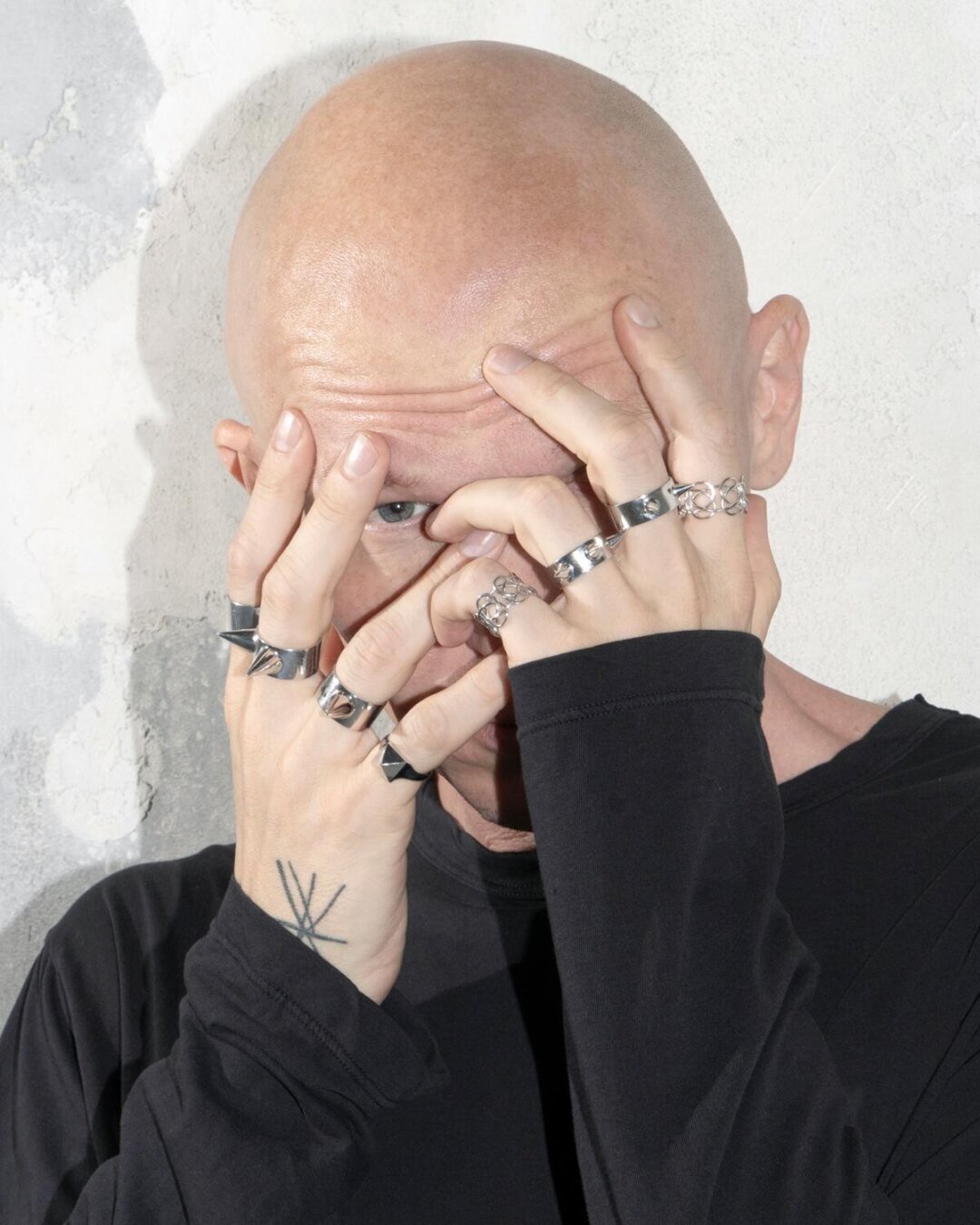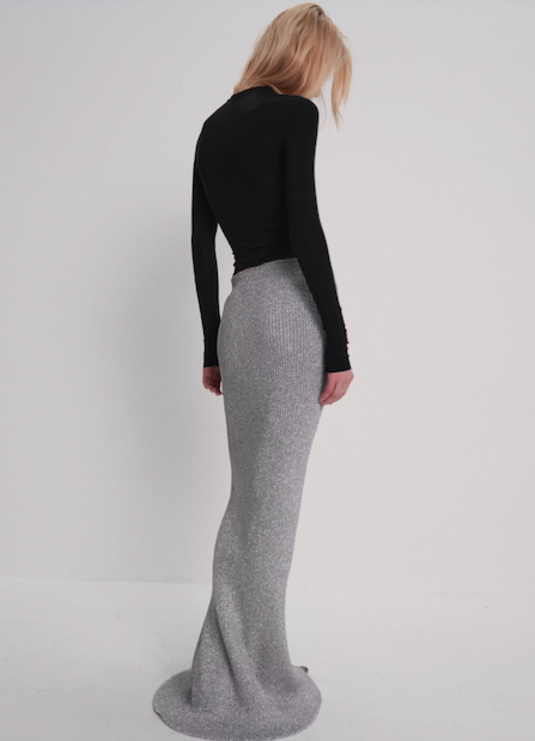 Единственная не черная вещь в коллекции — серебряная вязаная юбка — «кроссовер» с ювелирным брендом GOSHA KARTSEV, запущенный в 2024 с моносерьгами-булавками, крупными кольцами с клепками и шипованными чокерами.