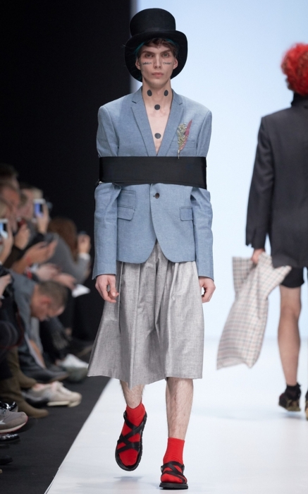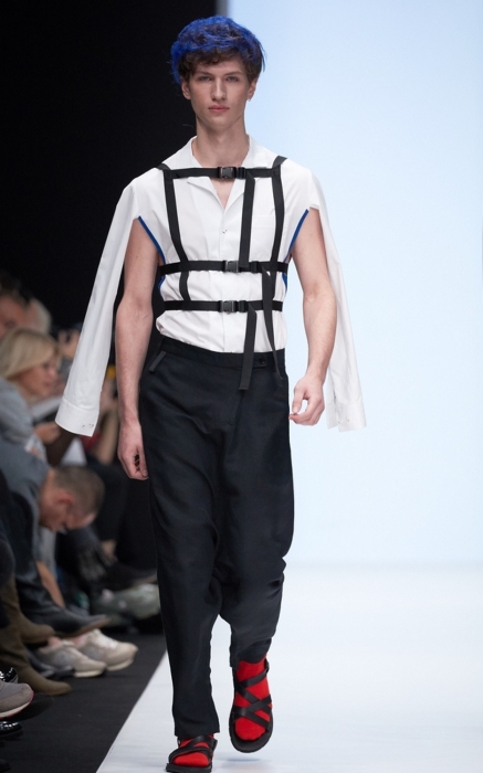 Мэган Виртанен: Каюсь, больше всего мне понравился элемент стайлинга — бандаж. Думаю, у каждого из нас есть знакомый юноша, которому смирительная рубашка подошла бы лучше любого другого варианта. Ну а если не ерничать, то это очень красиво и качественно, хотя не все вещи можно считать применимыми в условиях российских городов, где крайне традиционное и консервативное понимание мужского стиля.