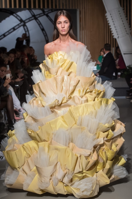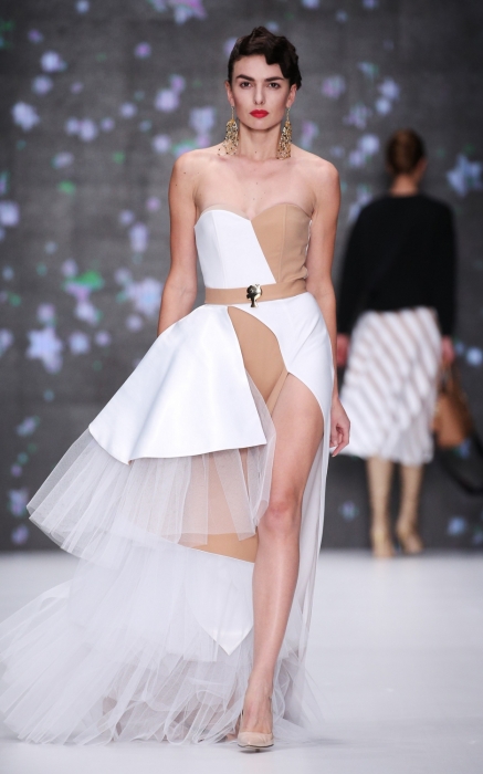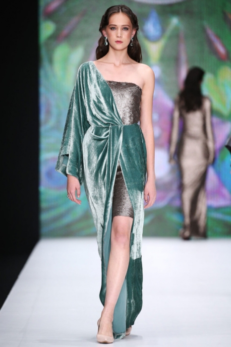 Мэган Виртанен: Ещё один бессмертный жанр — платье для выпускного и платье для корпоратива. С заходом на столь же бессмертные драпировки в духе греческих. Хочется сразу перефразировать классику: «Та богиня — мраморная, нарядить — от Ламановой, ой, простите, от Gauser». Только смотрю я на перья, и птичку жалко.