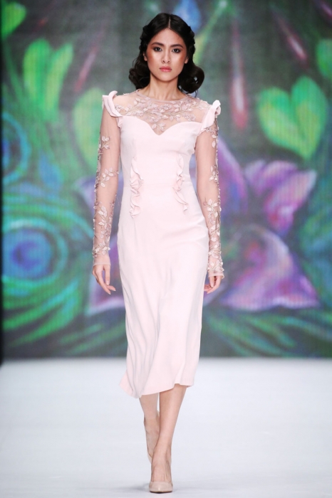 Екатерина Петухова: Уверена, что все эти наряды будут замечены нами в ближайшем июне на «Алых Парусах». Тут все выстроено по хронологии. Вот в первых образах юное создание еще собирается на выпускной — на голове банное полотенчико, потом она уже на празднике, платье в пол в нежных пастельных тонах, как известно, призванных подчеркнуть сияние молодости. И вот в конце «окончен школьный роман, махну сиреневой кистью», а в нашем случае — пером.