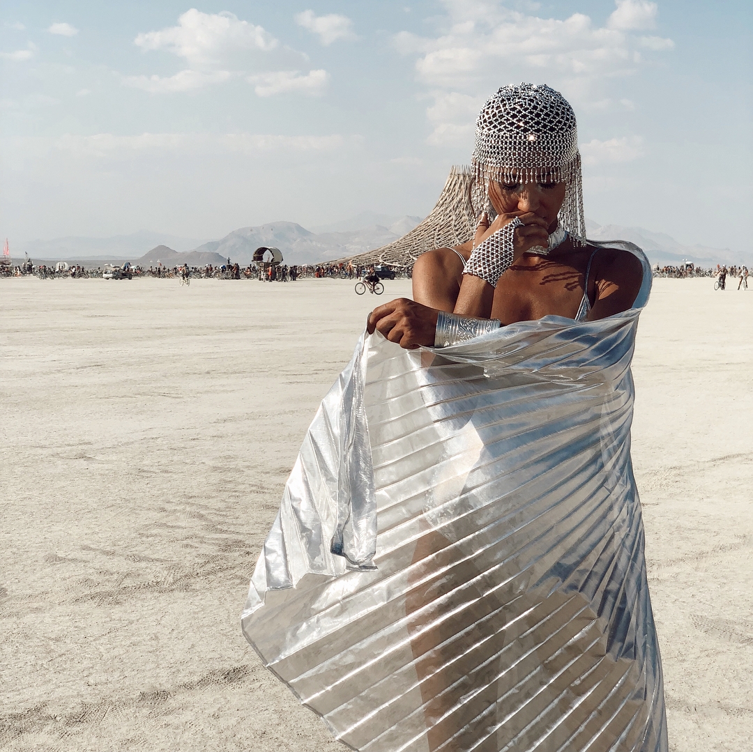Все, что в обычной жизни вам кажется странным, на Burning Man становится актуальным: устрашающие маски из металла, венцы из разноцветных перьев, сетчатые пончо, надетые на голое тело, кожаные корсеты, расшитые камнями, мотоциклетные маски, мимикрирующие под очки Gucci, и футуристичные боди, как у «Чудо женщины». Гости фестиваля готовятся к нему ни один сезон, заказывая костюмы у мировых брендов, специализированных мастеров и даже российских дизайнеров, в том числе у финалистки нашего конкурса «Новые имена в моде» Алисы Гагариной. В этом году она сделала белую корону с розовыми перьями для Алены Водонаевой — одной из немногих россиянок на Burning Man-2018.