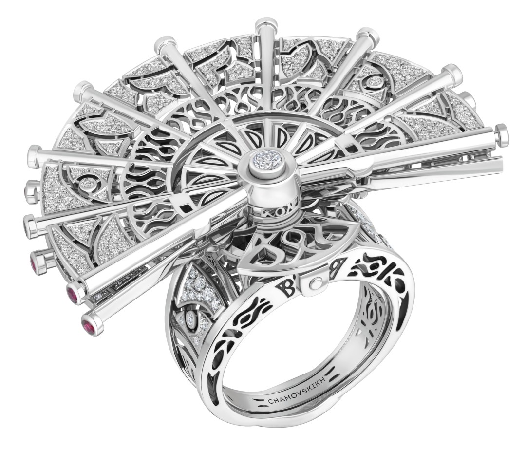 Кольцо из белого золота с центральным бриллиантом в 1,15 карата складывается из круга в полукруг по принципу японского веера утива.