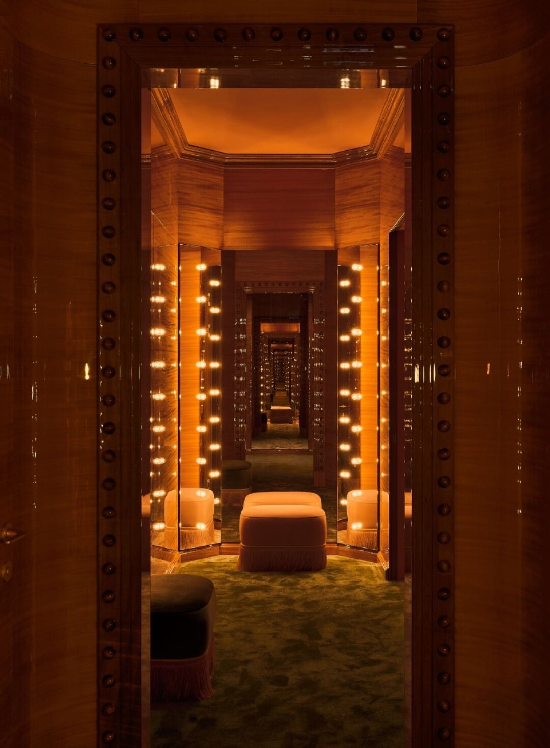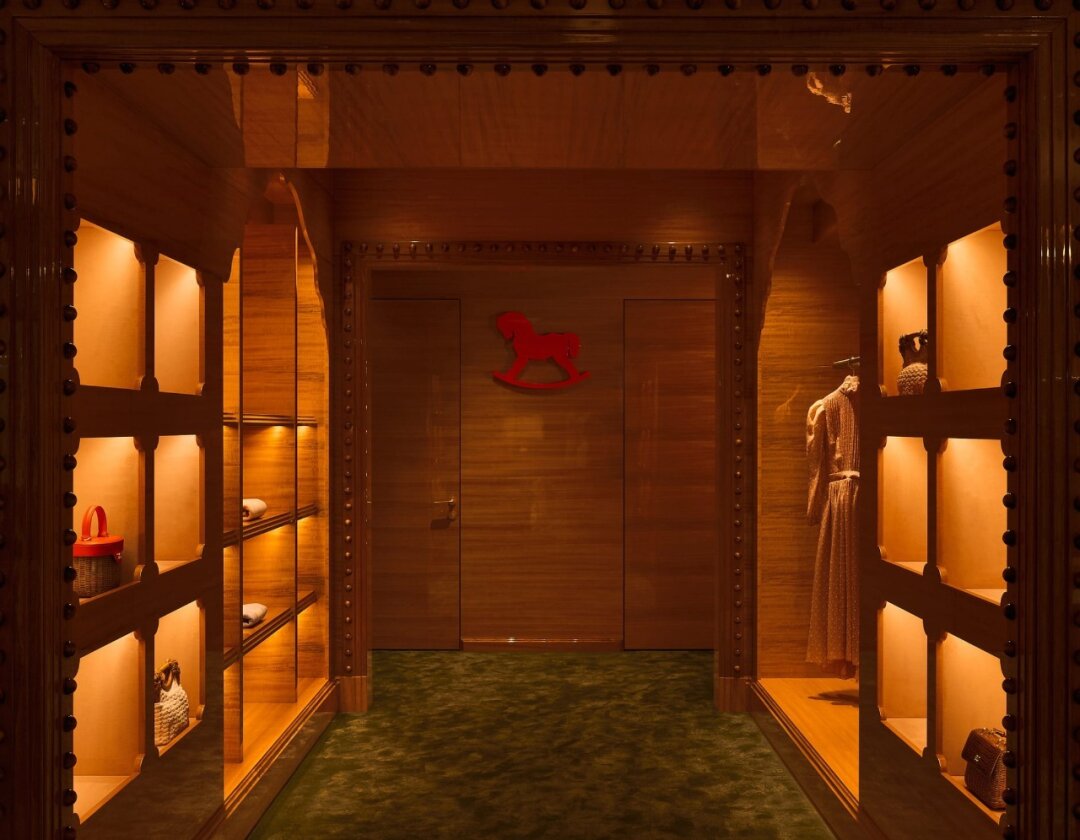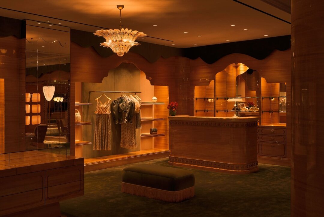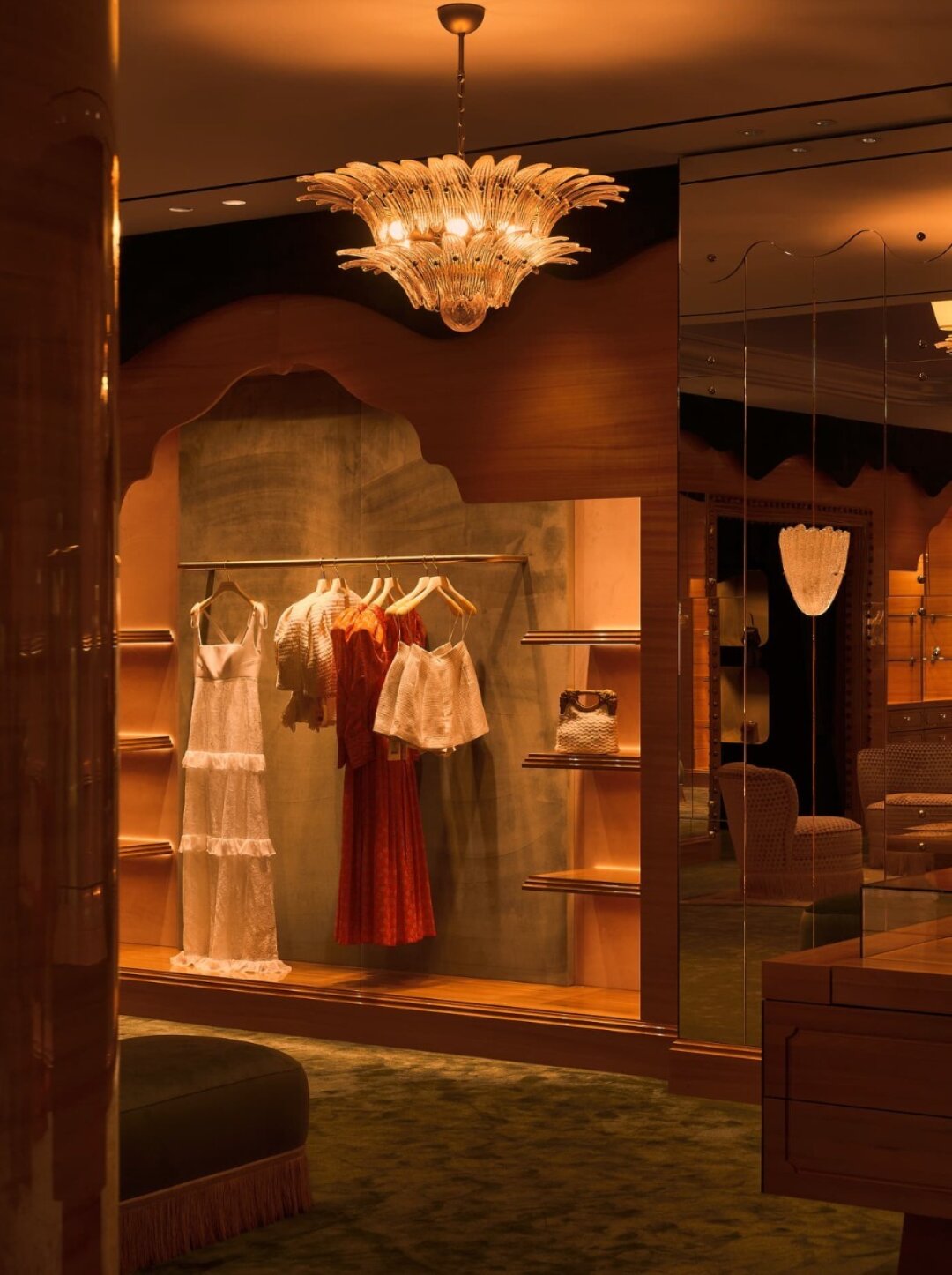 «Мы стремились отойти от привычного формата бутика и создать камерное пространство с идеально выстроенным светом, чтобы показать всю красоту кутюрных платьев Ulyana Sergeenko. Главные референсы — золотые 1950-ые, миниатюрные итальянские бары и гранд-поезд Восточный экспресс. Отсюда — обилие лакового дерева в отделке, портьеры-занавесы, диваны в духе ретро-вагона первого класса и барная стойка, украшенная розовым мрамором и фирменными игрушечными лошадками Ulyana Sergeenko. Манекены с ручной вышивкой создавались на заказ в Париже, а люстры из мурманского стекла собирали на винтажных рынках Италии и Техаса», — поделился Тим с Собака.ru.