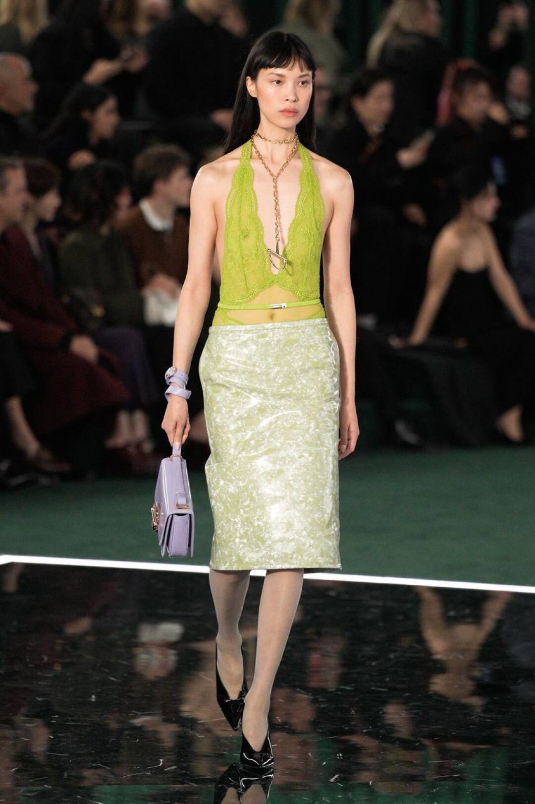 Сколько трензелей насчитали? Без отсылок к конному спорту никуда: дизайнеры отдали дань основателю Gucci Гуччио Гуччи и перенесли фирменные уздечки Horsebit на цепи, колье и пояса.