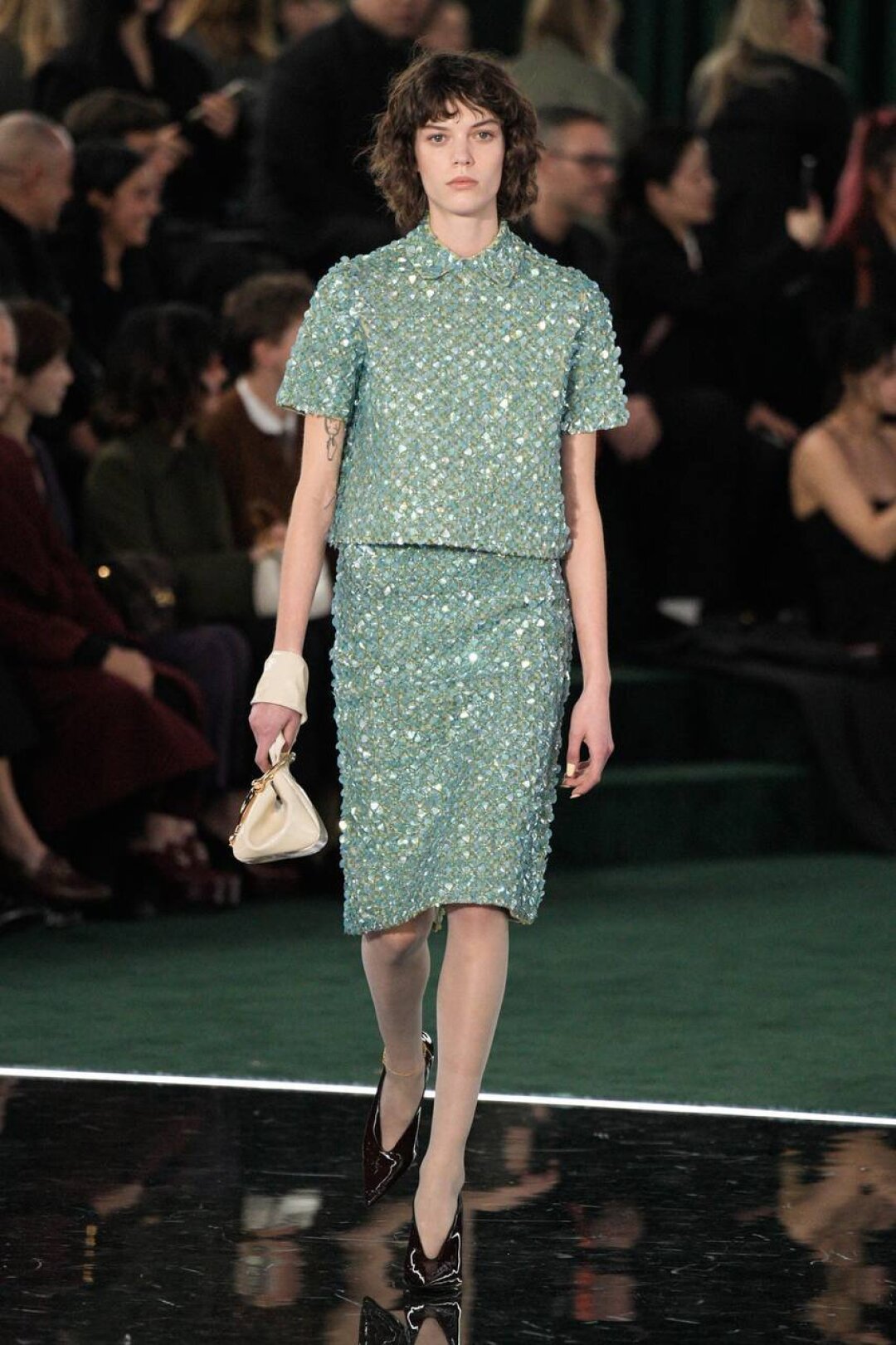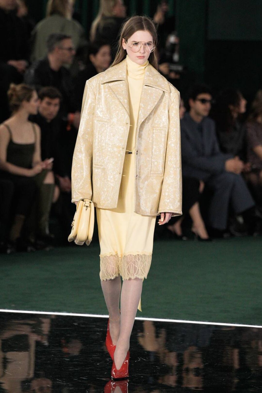 Пока будущее Gucci туманно, дизайн-команда оглядывается в прошлое: отшивает ретро-двойки в стиле ladylike, пальто-коконы из 50-х и мини-платья из 60-х, а еще — (не)заметно списывает у Сабато де Сарно неоновый зеленый, кружевные боди и комбинации. А вот фирменный цвет дизайнера — глубокий бордовый Gucci Ancora — заменили хвойным (тоже один из знаковых оттенков бренда).