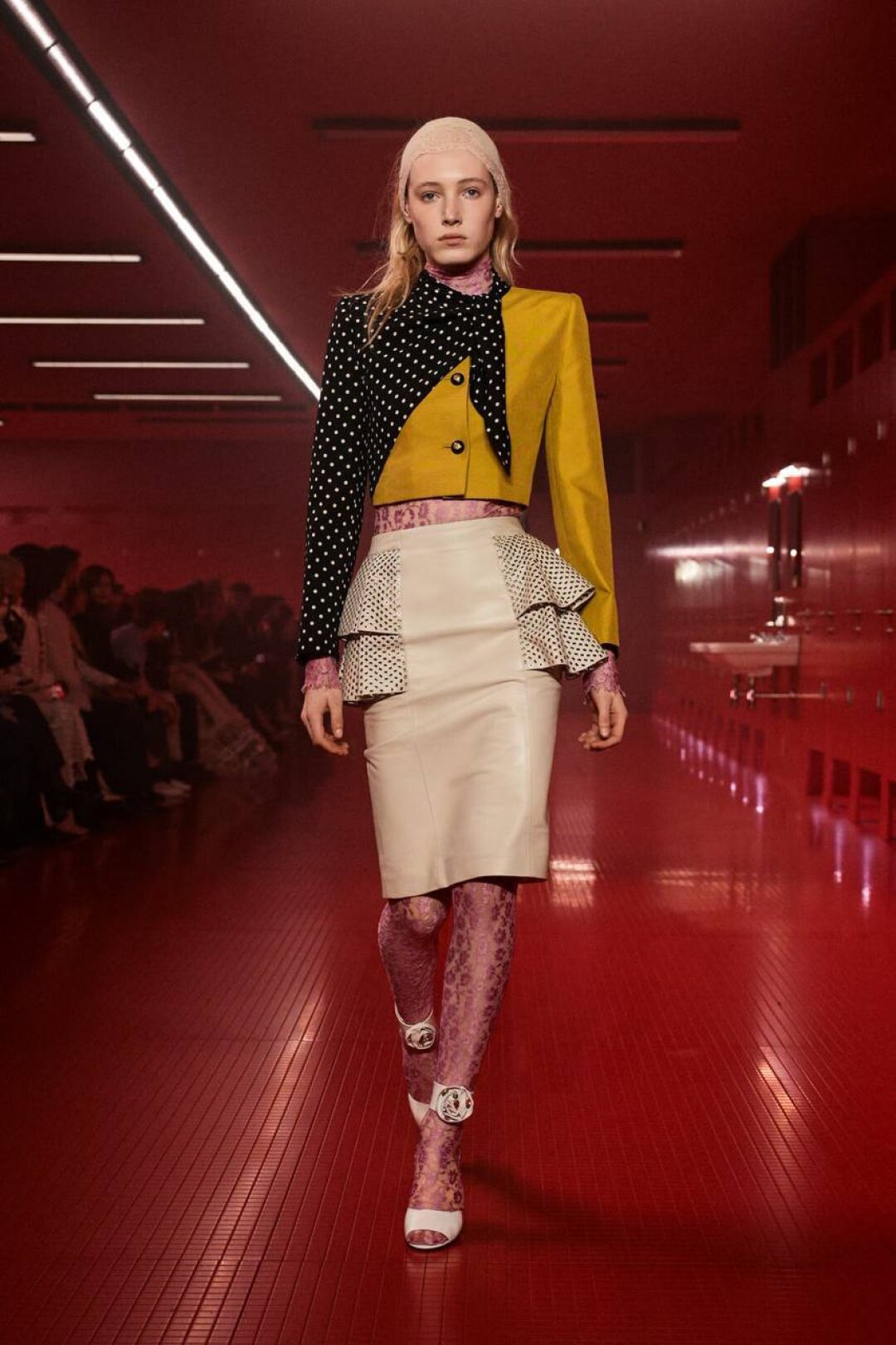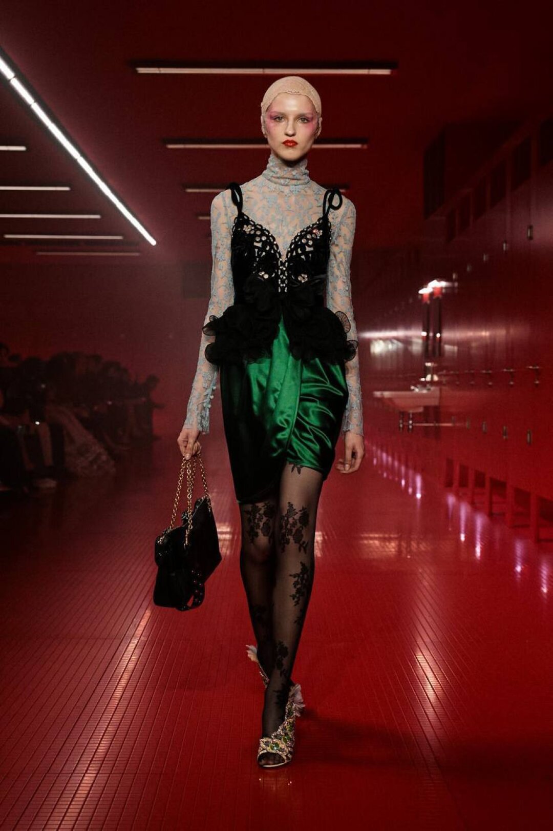 Раскрывая тему мнимой приватности, Микеле показывает прозрачные кружевные боди в тандеме шелковыми бра, бельевыми шортами и колготками, миксует будуаркорные халаты с флористическими узорами с офискорными рубашками и галстуками, выставляет напоказ утягивающие панталоны и превращает их в полноценный фэшн-айтем. Просвечивающий гипюр не делает образы откровенными или сексуальными, а, наоборот, будто заботливо прикрывает оголенные участки тела. Микеле дополняет ажурными топами платья-колонны и корсетные мини с открытыми плечами, а кэтсюты надевает под кроп-жакеты и ретро-юбки с оборками.