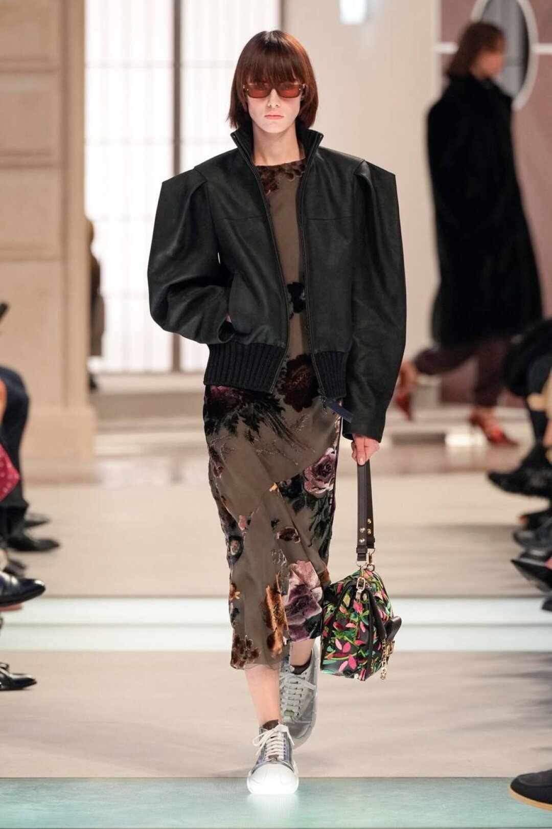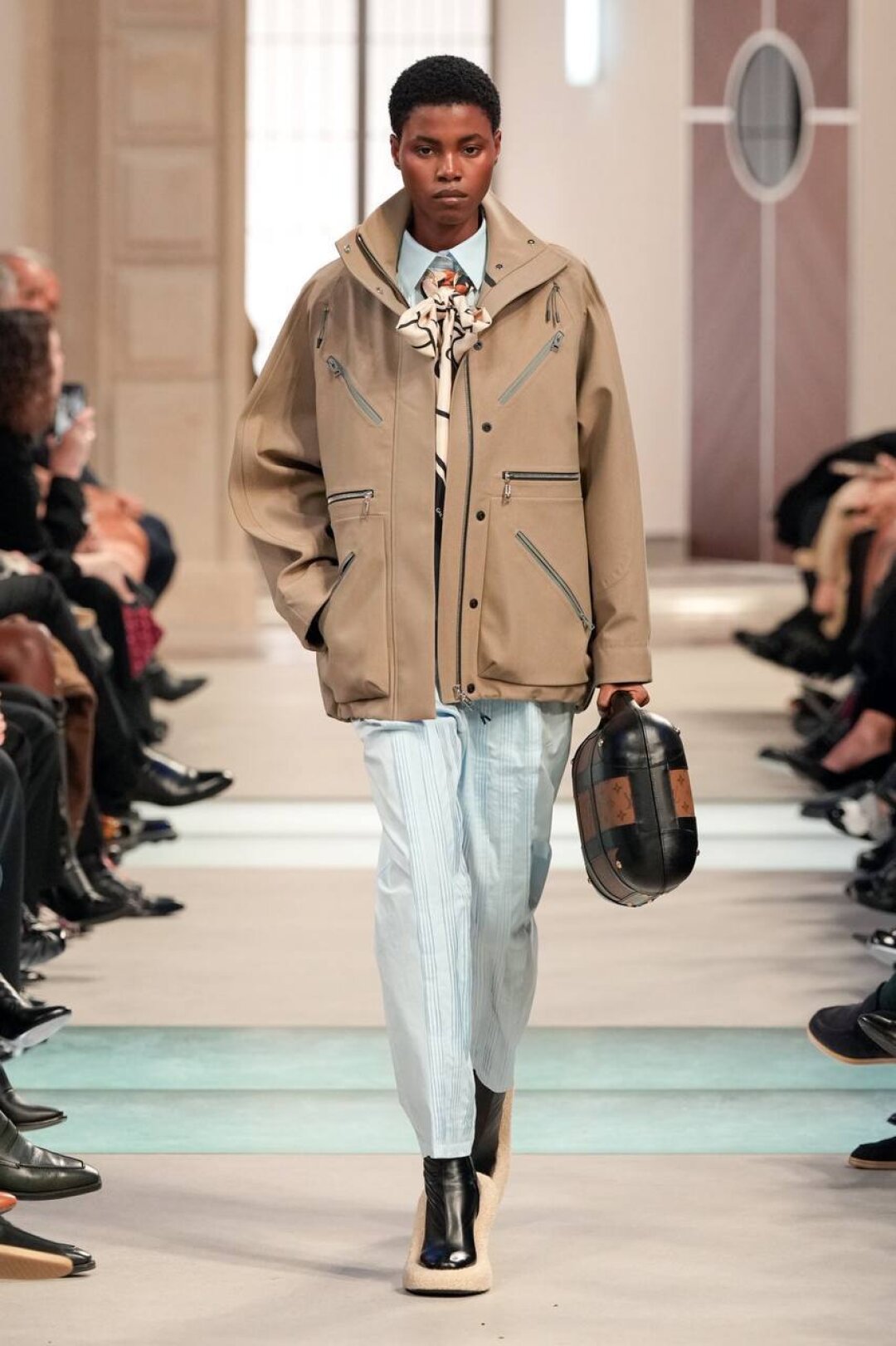 Главная куртка сезона (по мнению Николя Жескьера) — функциональная. На следующую осень (читай: на это петербургское лето!) худрук Louis Vuitton приготовил прозрачные тренчи-дождевики, мультикарманные ветровки и объемные гибриды одеял и кейпов. Жескьер по традиции миксует аутдор с ретро: женит силиконовый комбинезон с цветочной блузой и повязкой в тон из 70-х, ветровку — с  брюками-бананами из 80-х, футуристичные металлик-кроссовки — с декадентской чалмой и плюшевым пальто со страусиной отделкой и tavern wench сет из графитового толстовочного футера.