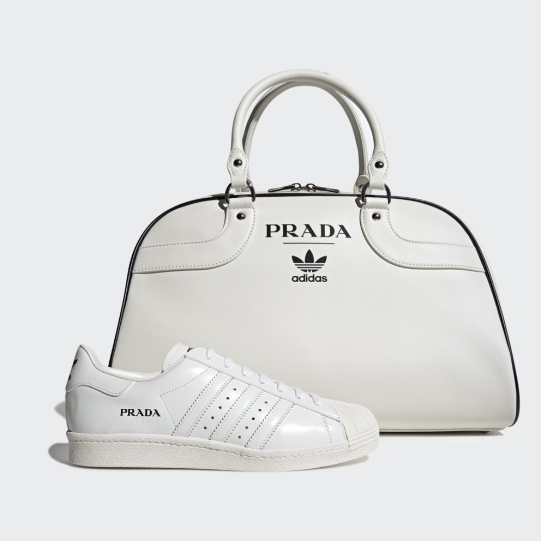 В нее вошли кроссовки Adidas Superstar, на которых теперь красуется слово Prada. Они будут выпущены тиражом в 700 пар и каждая будет пронумерована, также в коллекцию вошла сумка Prada.