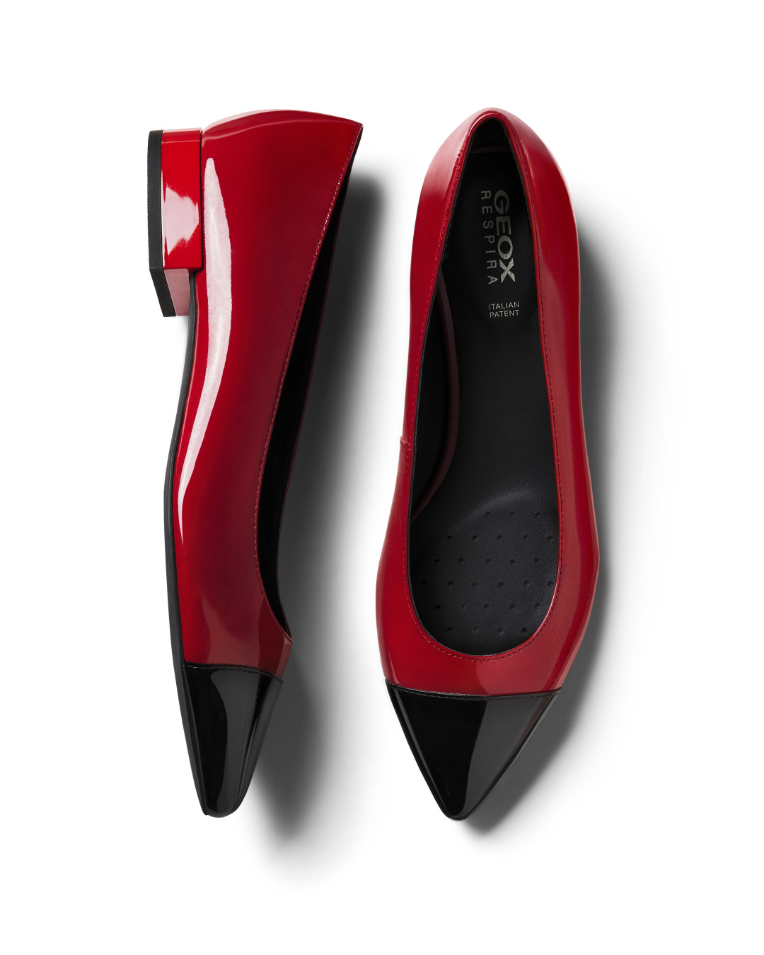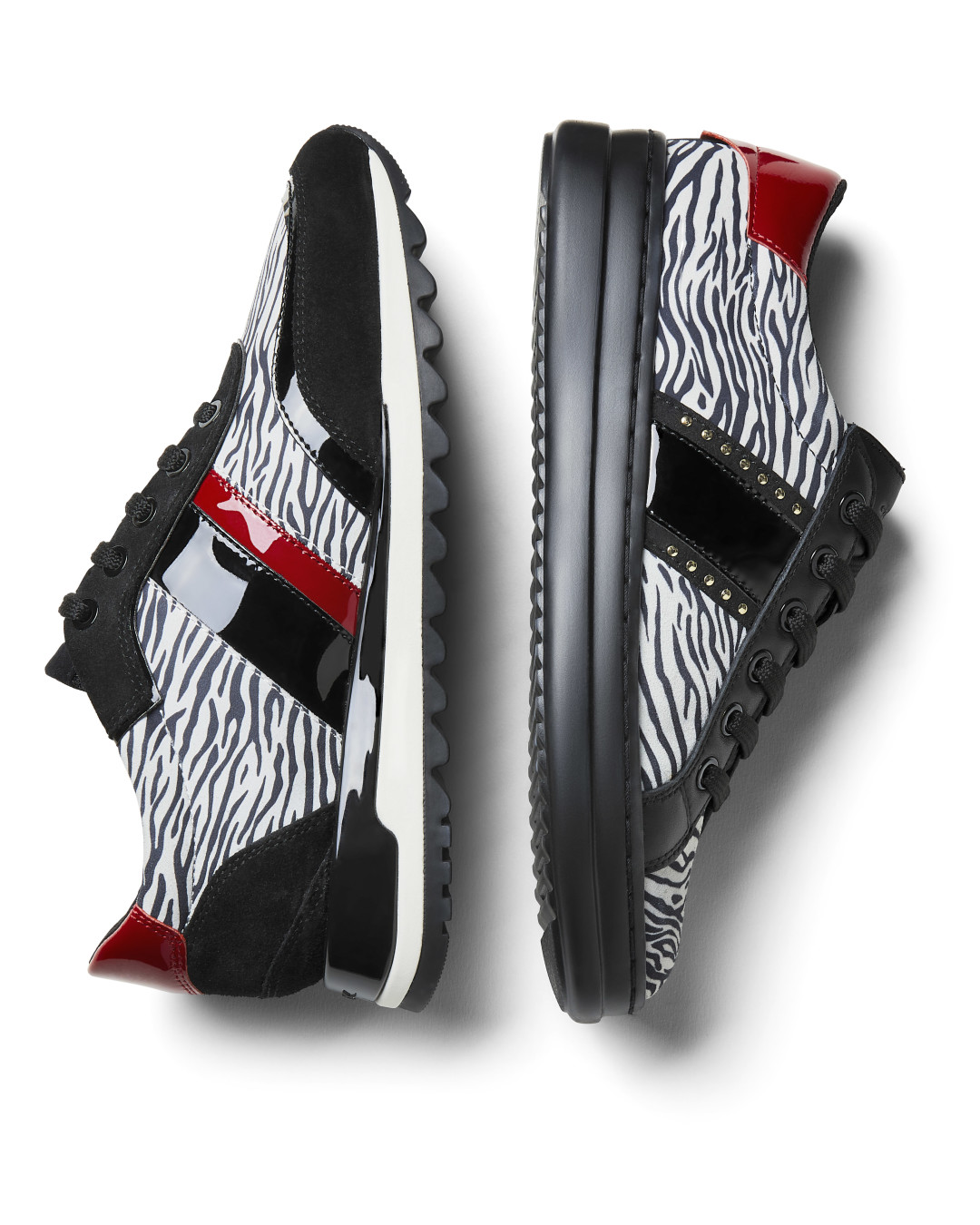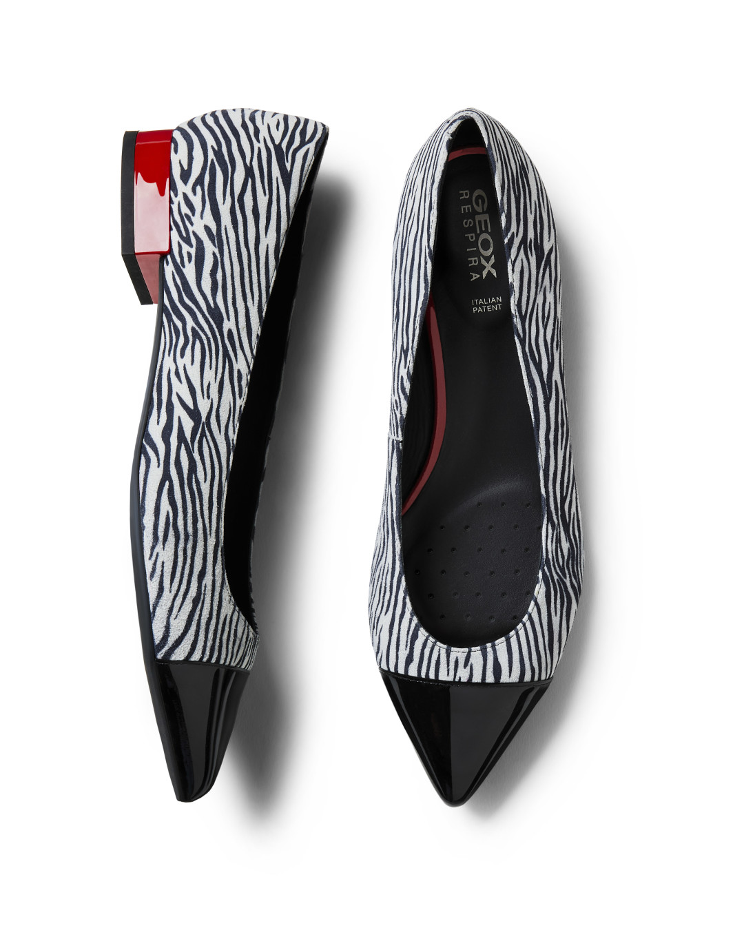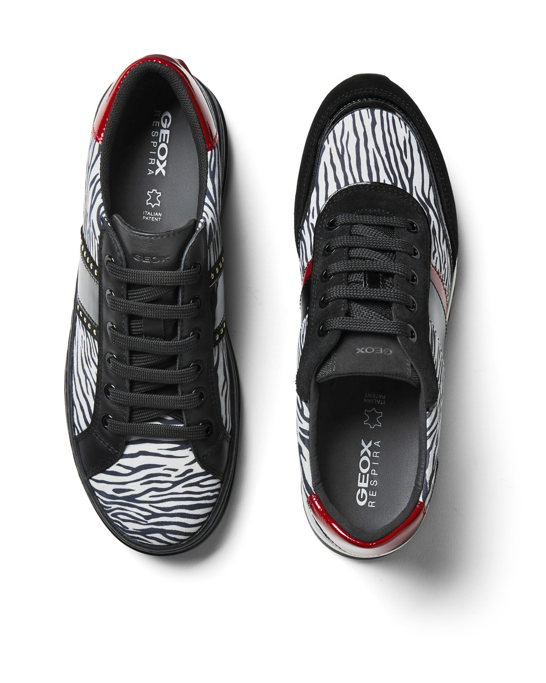 Праздничная коллекция бренда состоит из классических лодочек на каблуке, балеток, кроссовок узнаваемого силуэта Geox и ботильонов. В цветовую палитру коллекции вошли красный и белый цвета — традиционные для Рождества, а также черный. Главный принт — зебра.