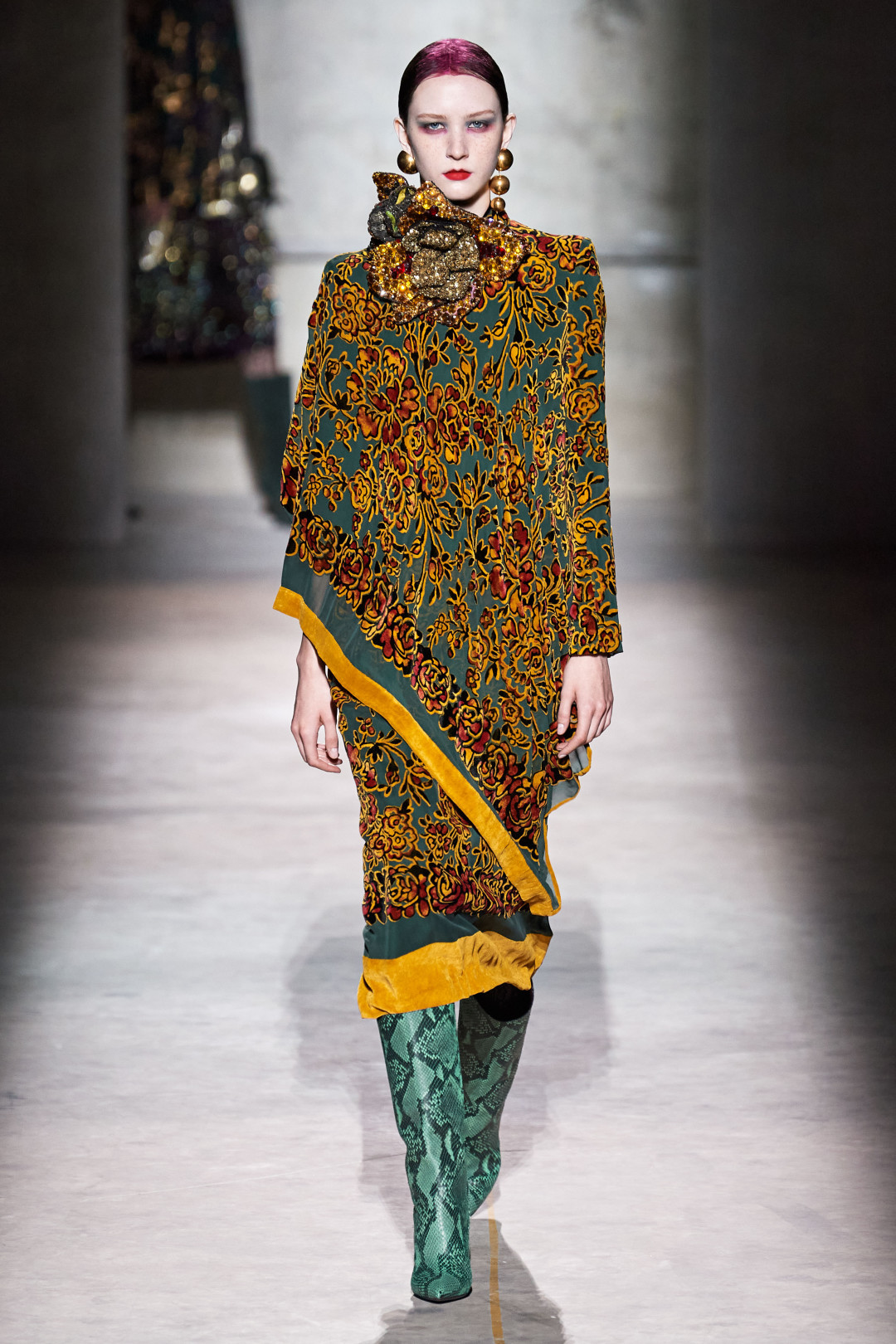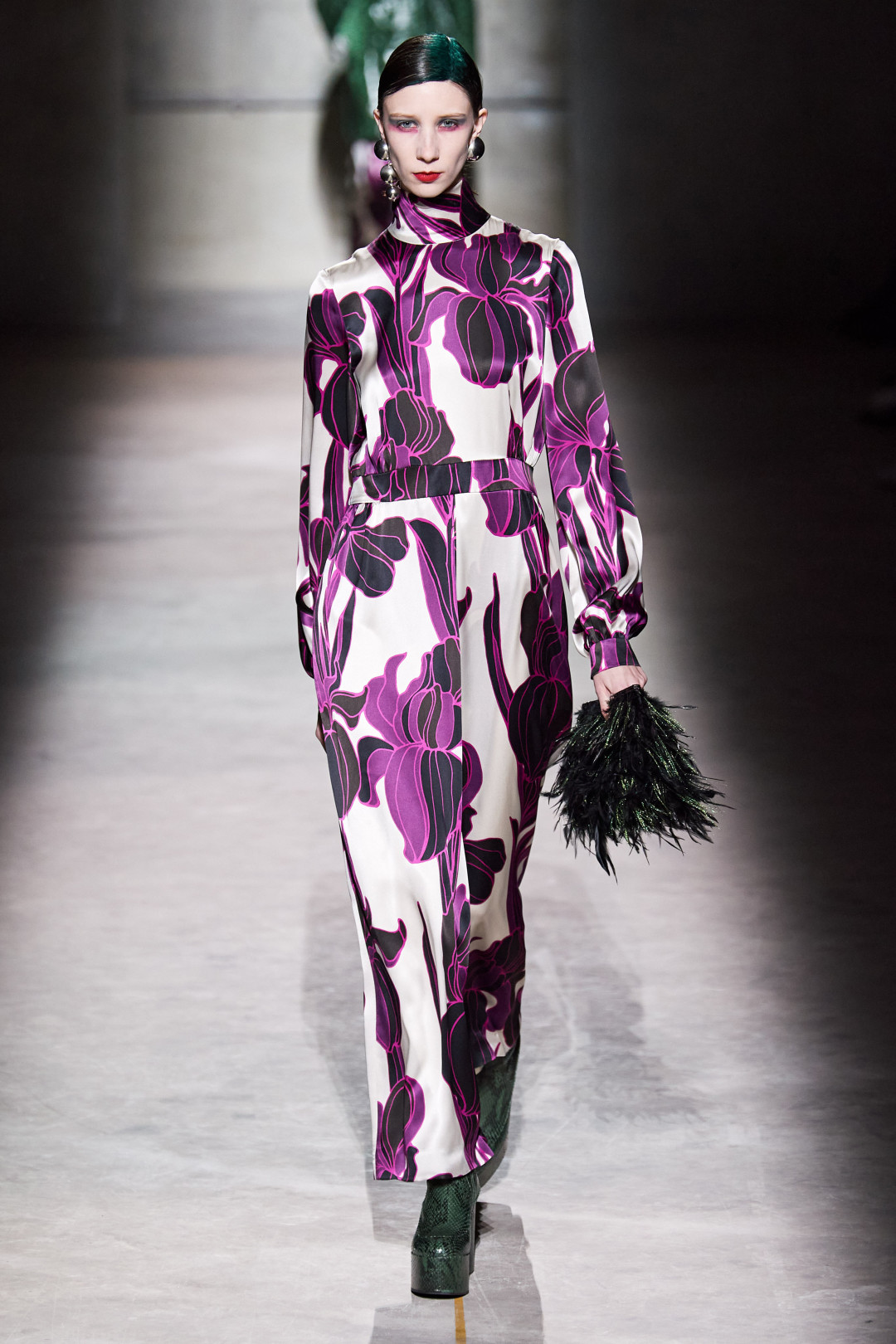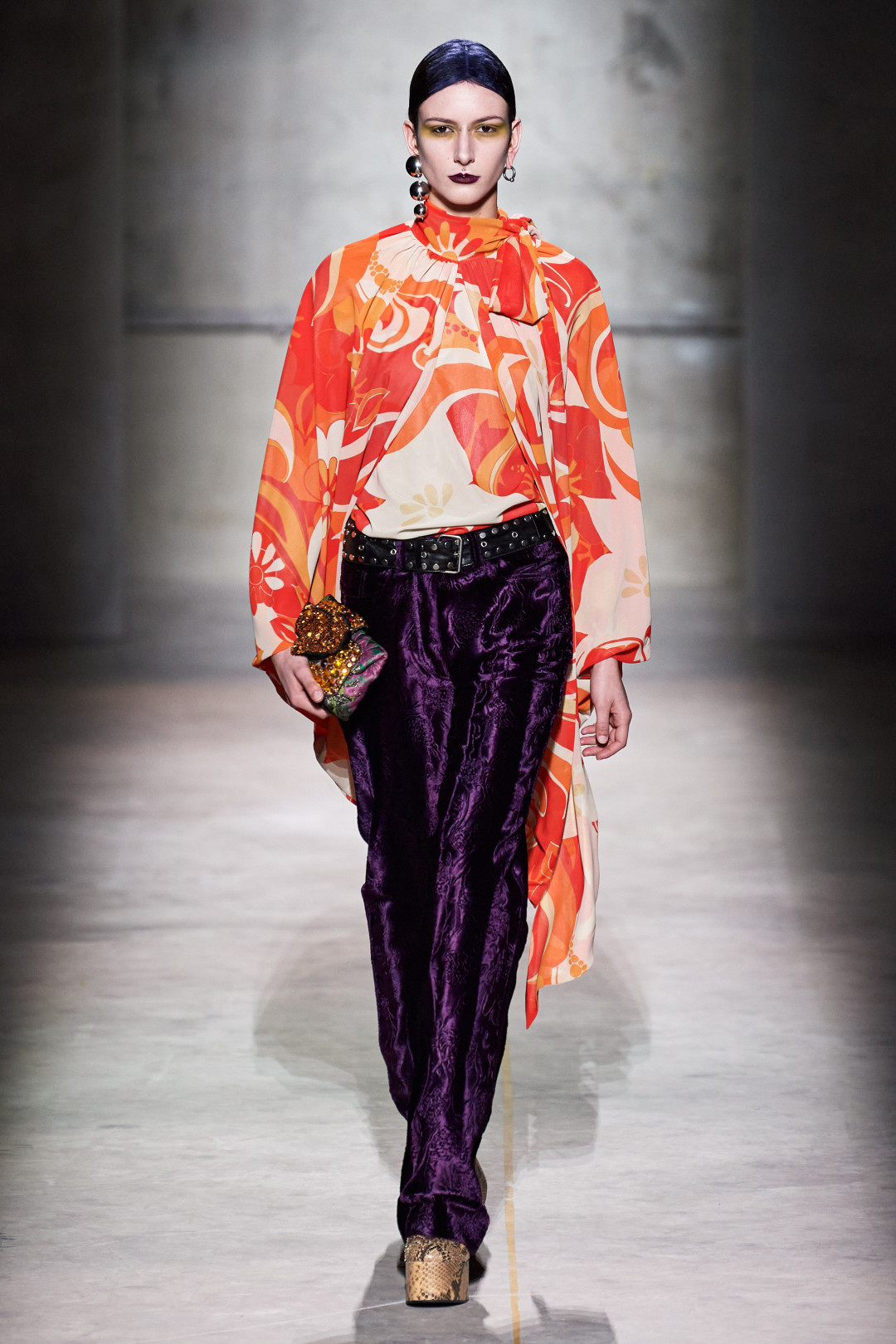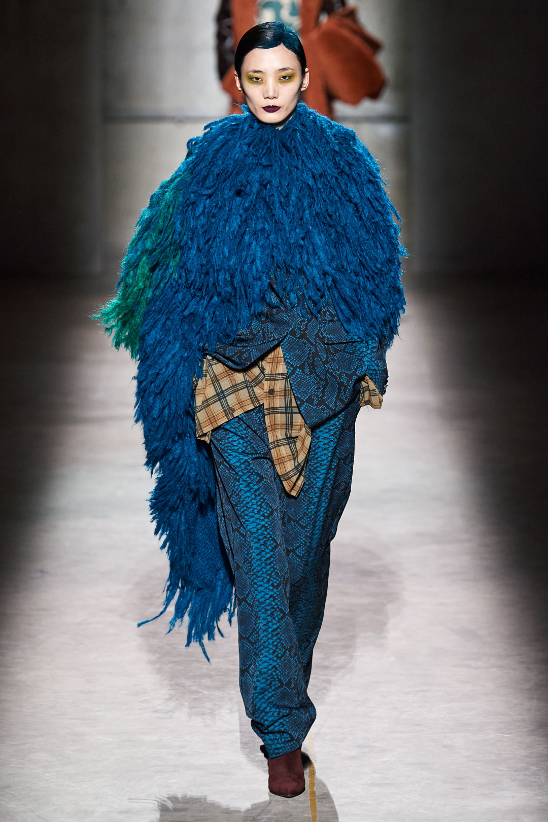 В Dries Van Noten предлагают новое понятие – оверстейтмент! Перья страуса и пайетки, вышивки и дико яркие принты – после суперудачной коллаборации с Кристианом Лакруа в новом сезоне Дрис Ван Нотен продолжил линию dress-to-kill. Вообще-то коллекция посвящена вечеринкам: силуэт и сочетания цветов дизайнер искал в ночной жизни Лондона и Нью-Йорка рубежа 1970-х, где на танцполе запросто могли встретиться Кит Харринг и Джерри Холл. О том, что дело происходит в наши дни, напоминает свободный крой, где градус экстравагантности страусиных перьев снижает небрежность оверсайзовой клетчатой рубашки, а драму экзотичного цветочного принта уравновешивают мешковатые почти пижамные брюки.