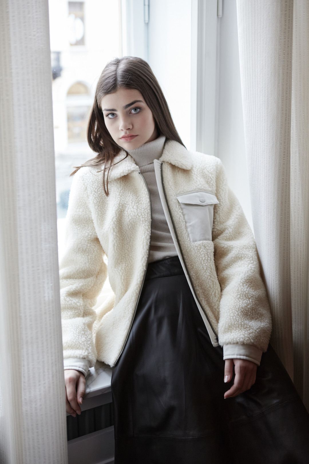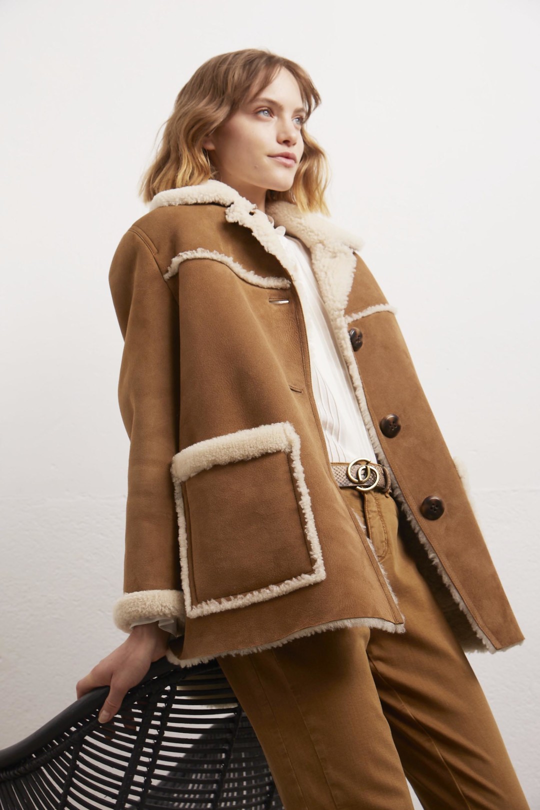 Актуальная дубленка? Gerard Darel из овчины: прямого кроя, песочного цвета, с накладными карманами и оторочкой. Носить предельно буржуазно: с брюками в тон и белоснежными рубашками.