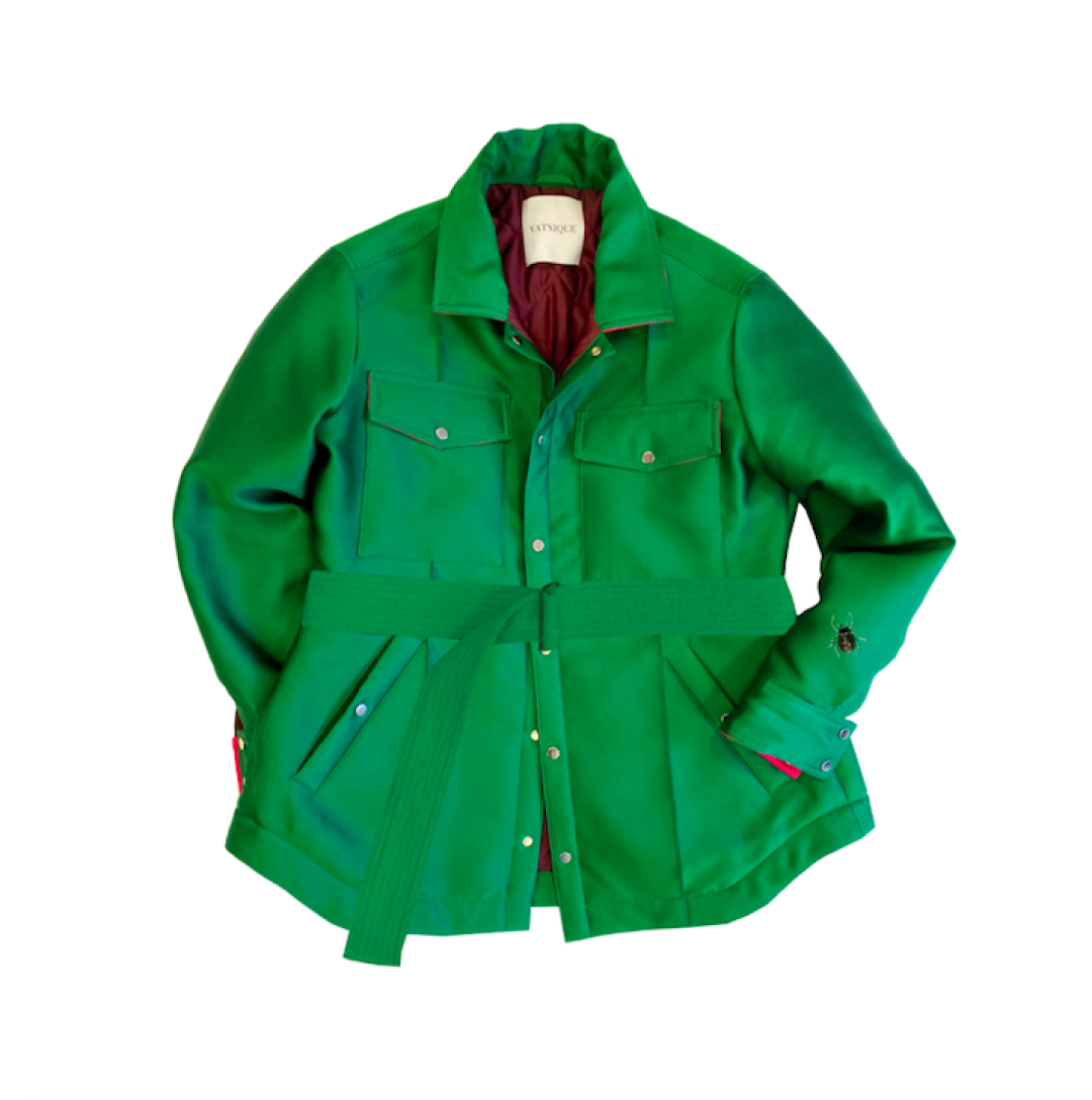 Капсульная коллекция петербургского агендерного и sustainability-бренда Vatnique посвящена Эльзе Скиапарелли: детали трех курток из парчи, шелка и твида отсылают к истории эксцентричной французской модельерши. Наш ватник-фаворит — изумрудный, с подкладкой цвета shocking pink и вышитом на рукаве скарабеем.