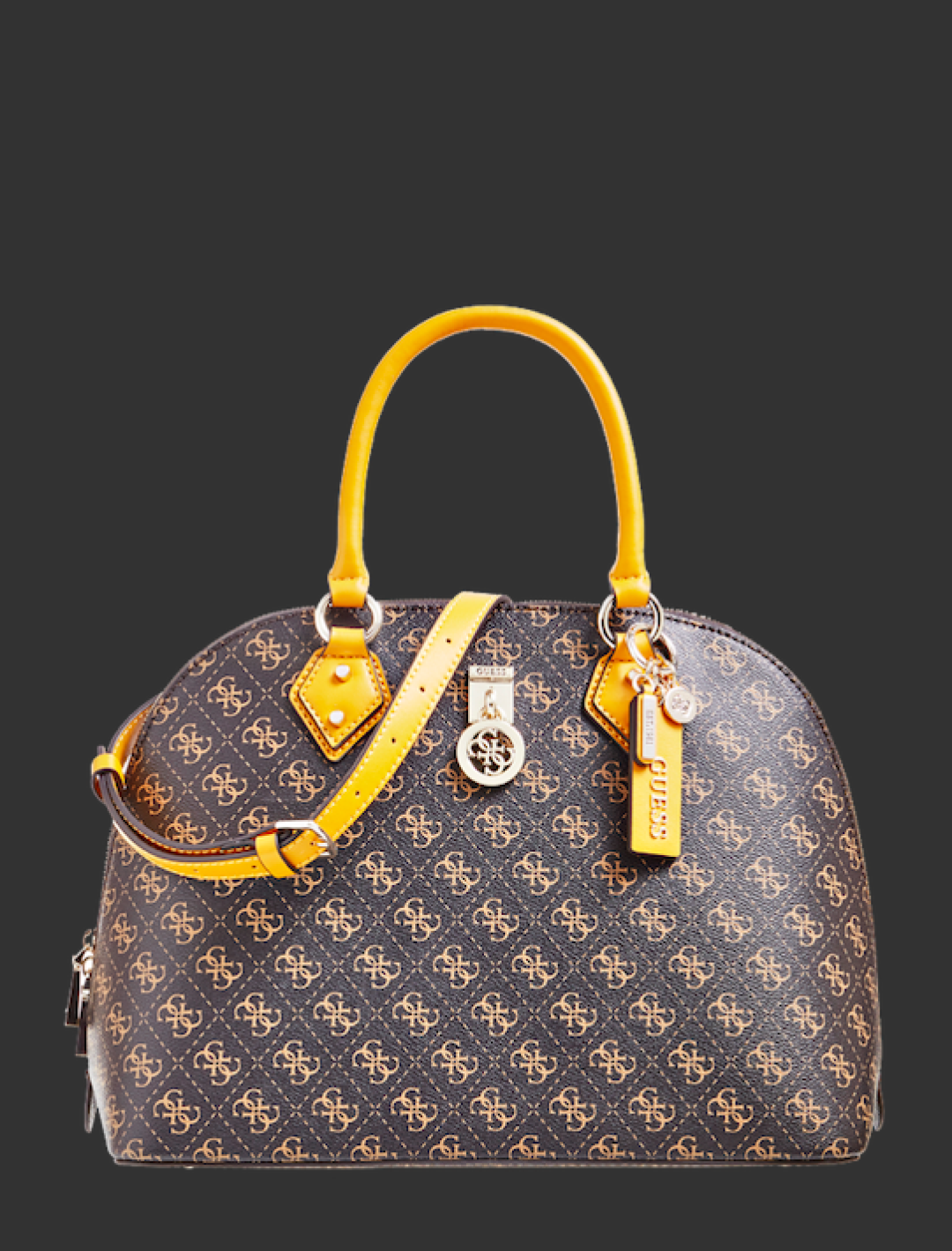 Новый вариант сумки-сэтчел с ремнем через плечо Guess снабдили фирменной монограммой 4G, где четырежды повторяется заглавная буква бренда, и контрастными вставками горчично-желтого цвета.