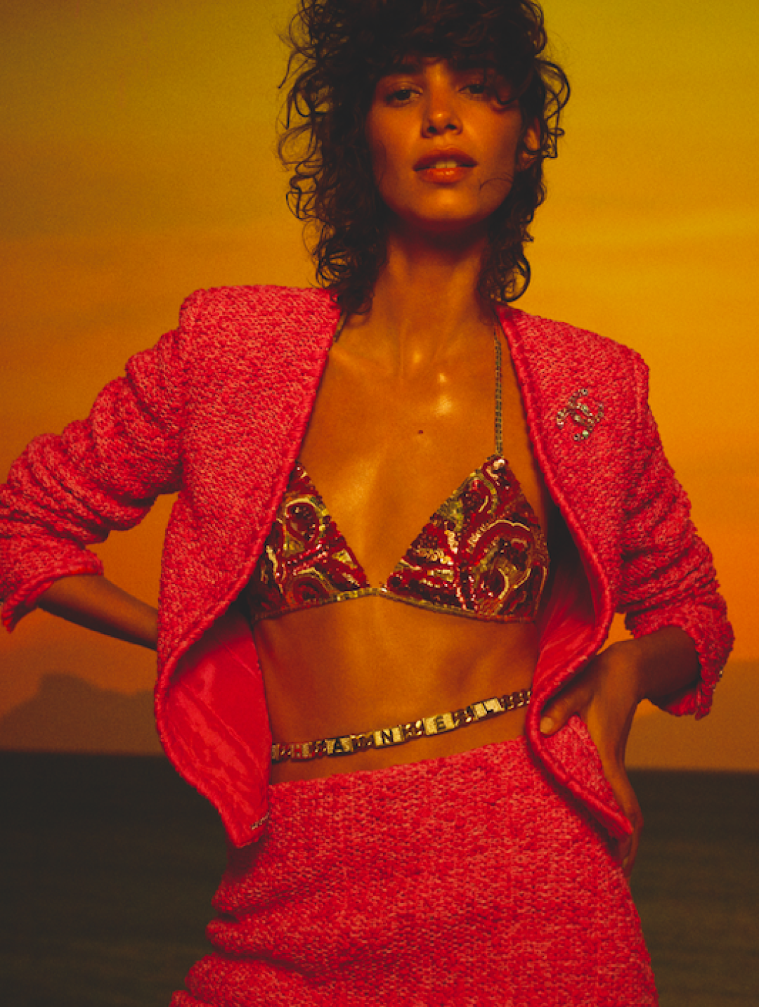 Классическая твидовая двойка Chanelоттенка бугенвиллеи? Да, причем с лифом, расшитым пайеточным ориентальным узором и золотыми украшениями с логотипом. Пусть круизную коллекцию дома «Путешествие по Средиземноморью» не все мы можем выгулять на Капри, но представьте, как лайкоемко будет выглядеть этот лук на фоне суздальских наличников или карельского мраморного карьера.