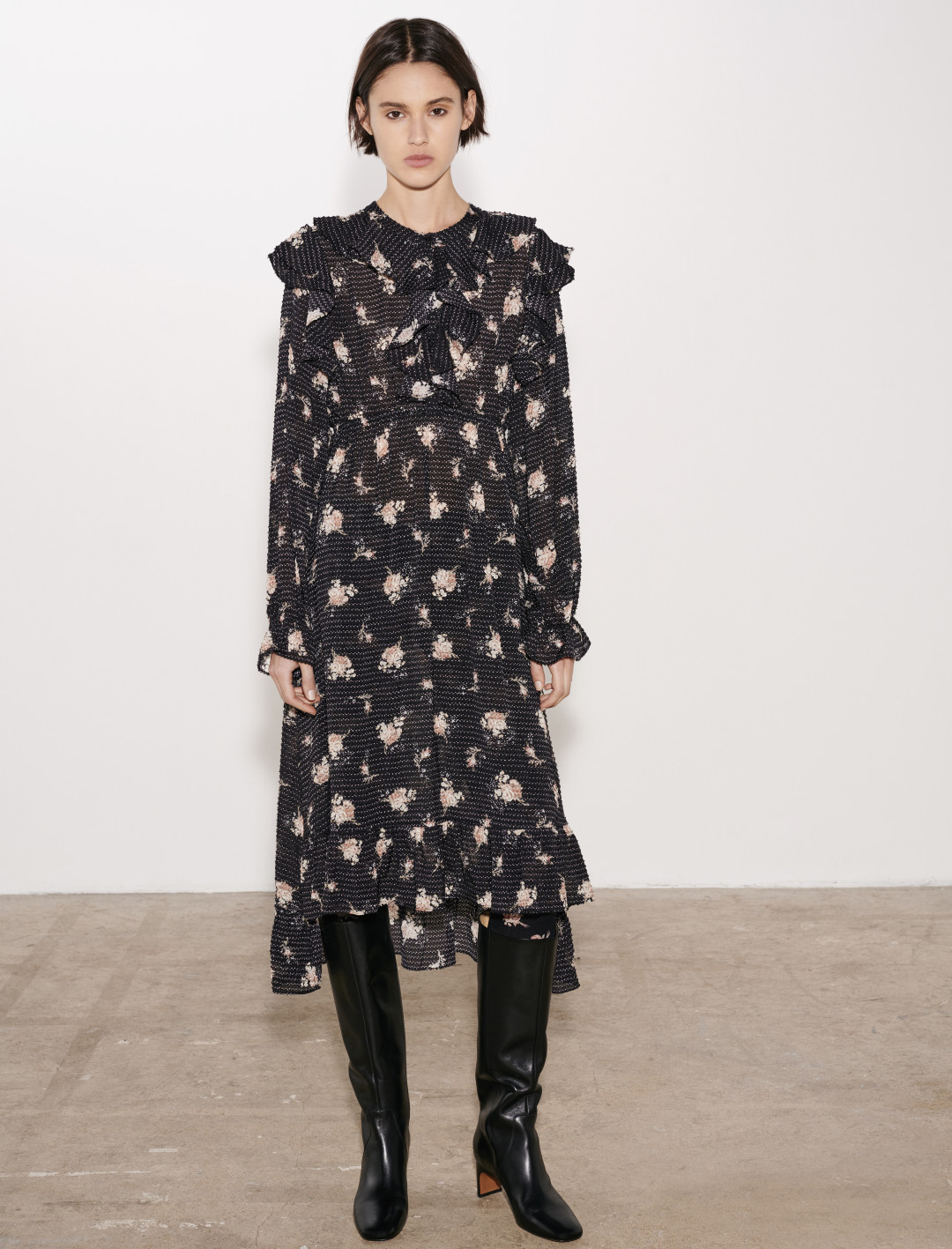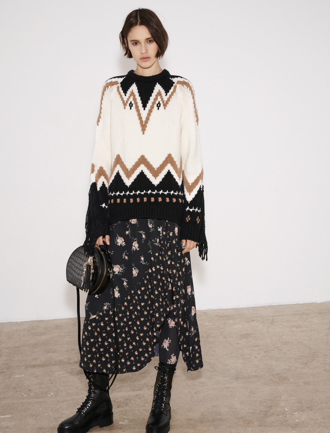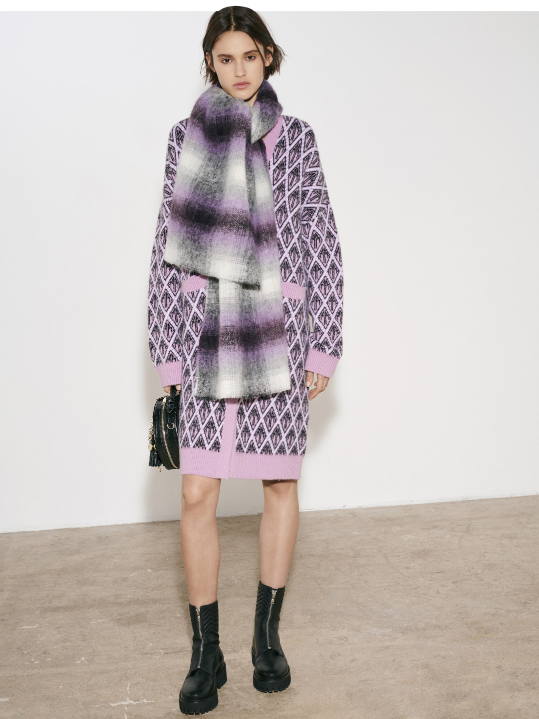 Джудит Милгром, основательница и креативный директор Maje, – фанатка рок-эстетики. В зимней кол- лекции она взялась за неогранж, который в новой реинкарнации неожиданно стал очень романтичным. Викторианские воротнички, нежный цветочный принт на черном фоне и банты дизайнер забруталила объемными свитерами и кардиганами, оверсайзовыми пальто в клетку и, конечно же, грубыми ботинками.