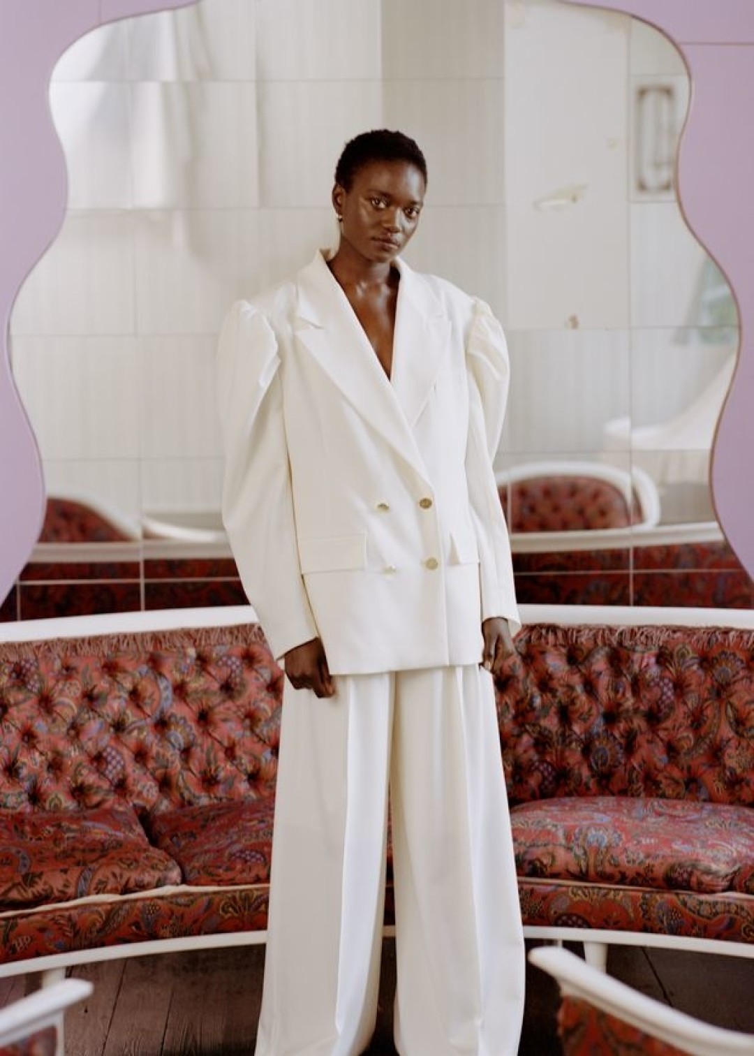 В коллаборацию вошли широкие брюки, двубортный оверсайз блейзер с подплечниками, топы и платья со сборками, клетчатые рубашка и мини-обка, прямой блейзер колор-блокинг, платья с объемными рукавами и аксессуары: цепи, серьги и кольца.