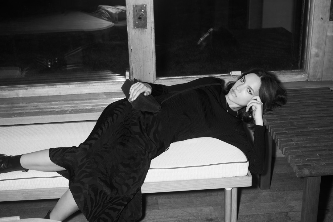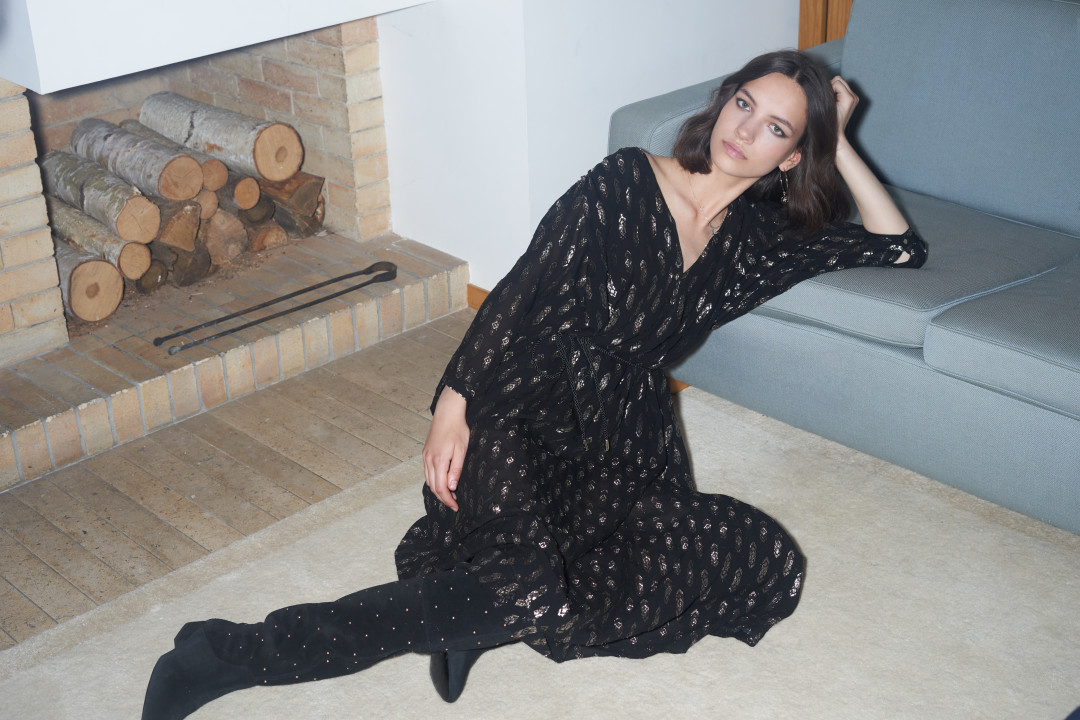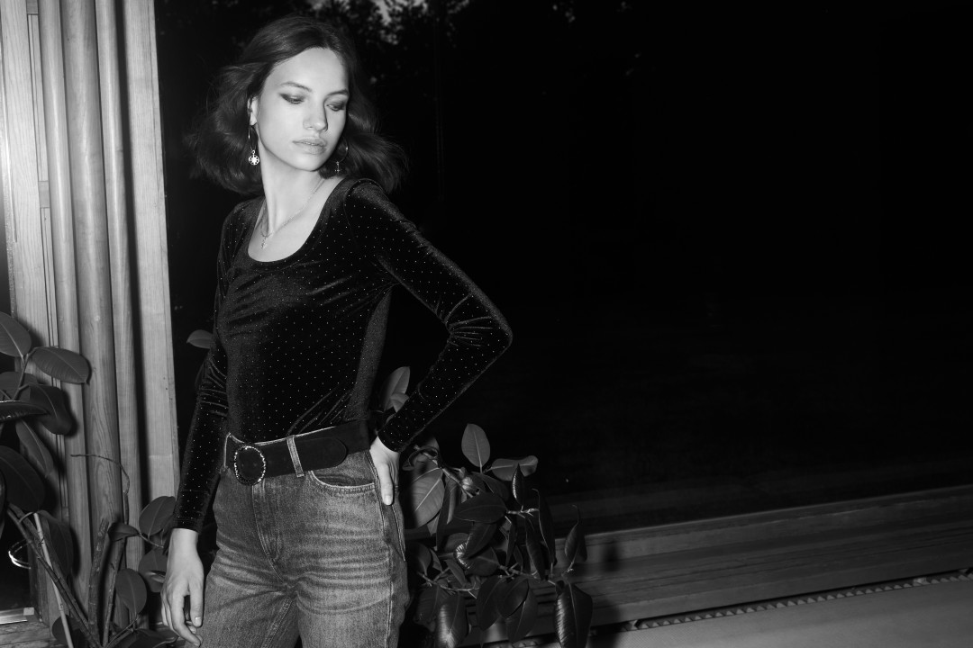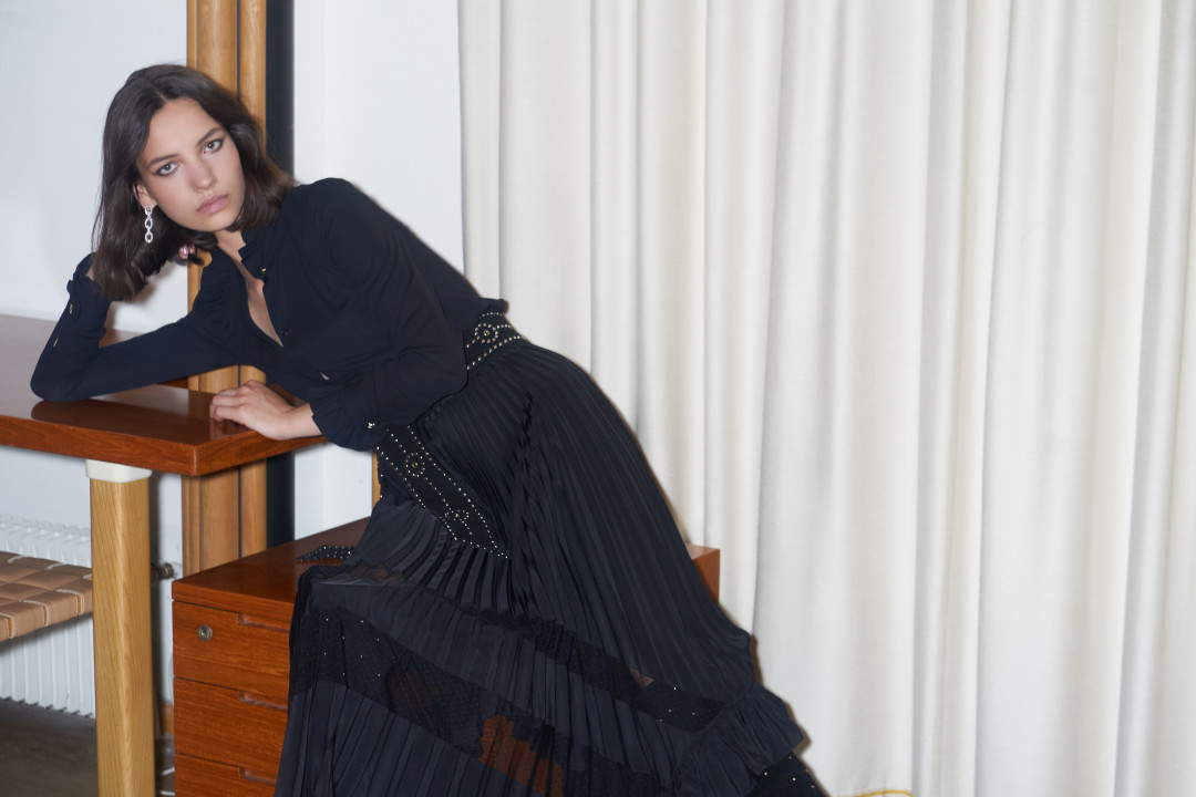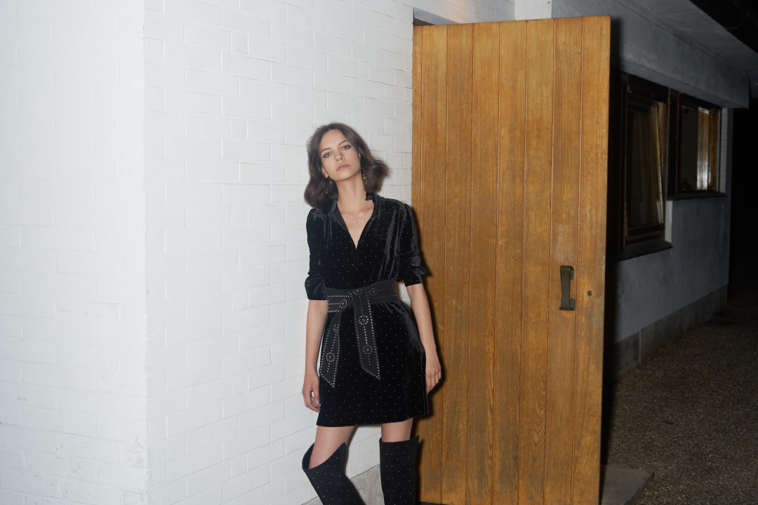 Вся вечерняя коллекция Claudie Pierlot выполнена в угольно-черном цвете, исключение — джинсы с высокой талией классического оттенка, которые следует носить с бархатным боди, украшенном стразами. Платья и аксессуары дизайнеры бренда тоже дополнили металлизированными элементами: заклепками, пайетками, шипами. Смягчают агрессивное настроение воротники-стойки, силуэты с запахом, жаккардовые детали, оборки и длина макси. В общем балансируем на грани, как, впрочем, и весь 2020 год.