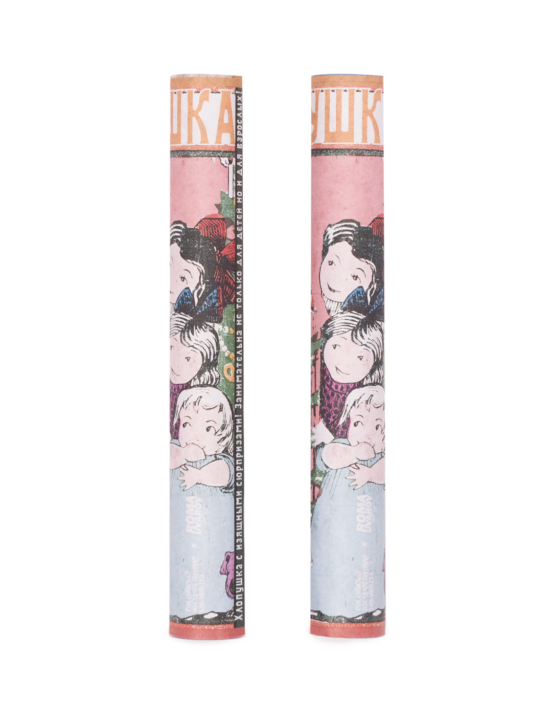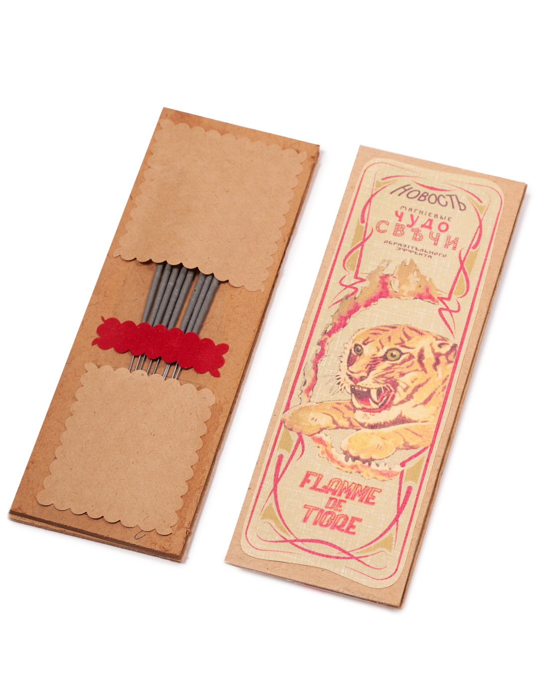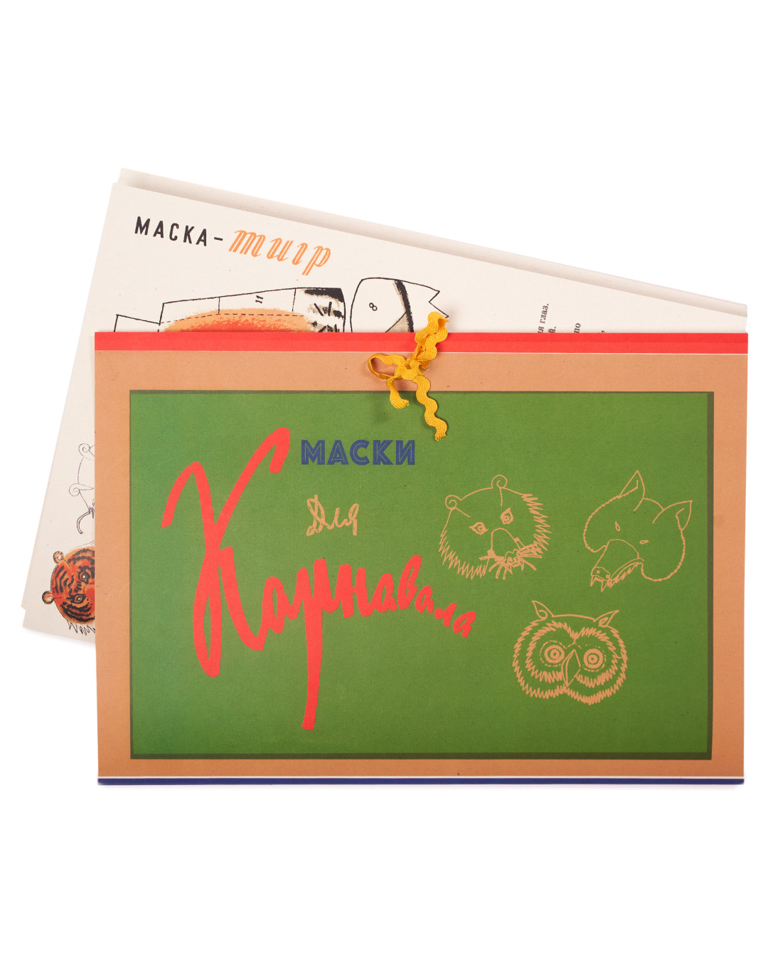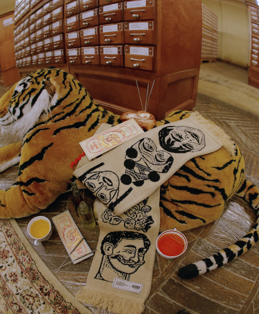 Результат погружения в визуальные коды дореволюционной эпохи — классическая картонная хлопушка с конфетти с изображением сюжета из архивного прейскуранта, упаковка для бенгальских огней — пример апсайклинга (неотъемлемой части ДНК RomaUvarovDesign) — из винтажной упаковочной бумаги, в которой в библиотеку доставляли книги и которую специально искали во всех фондах, шарф, украшенный принтом из карнавальных масок и изображениями различных персонажей, набор карнавальных масок «Сделай сам» — пример воссозданных винтажных масок с изображениями волка, тигра и совы, а также набор новогодних открыток, повторяющих дореволюционные праздничные изображения.
