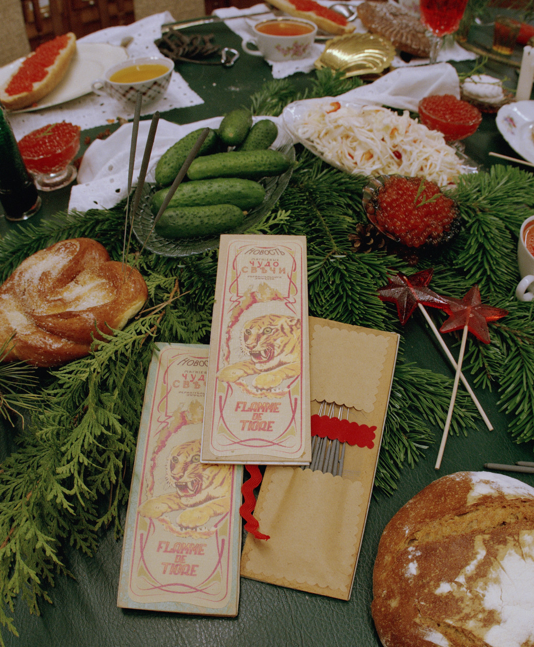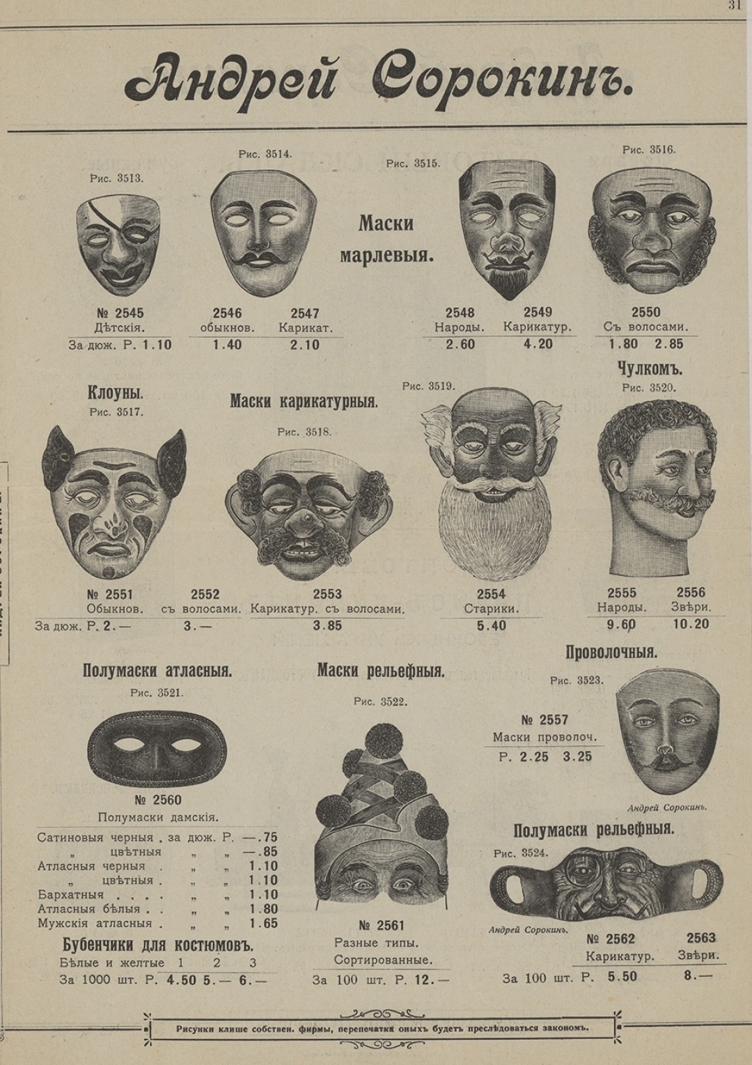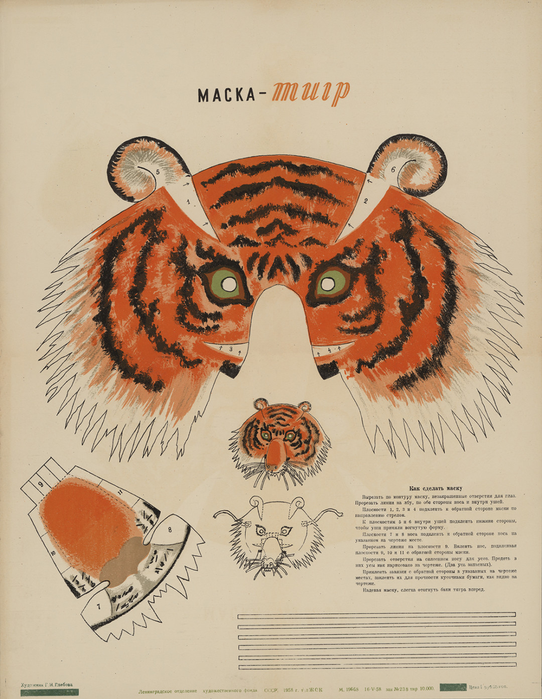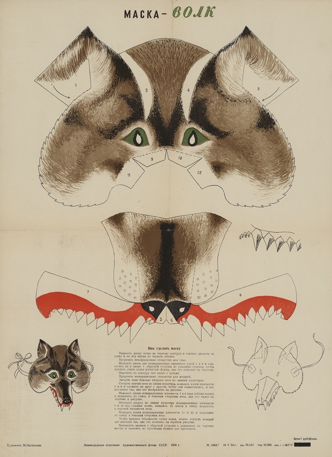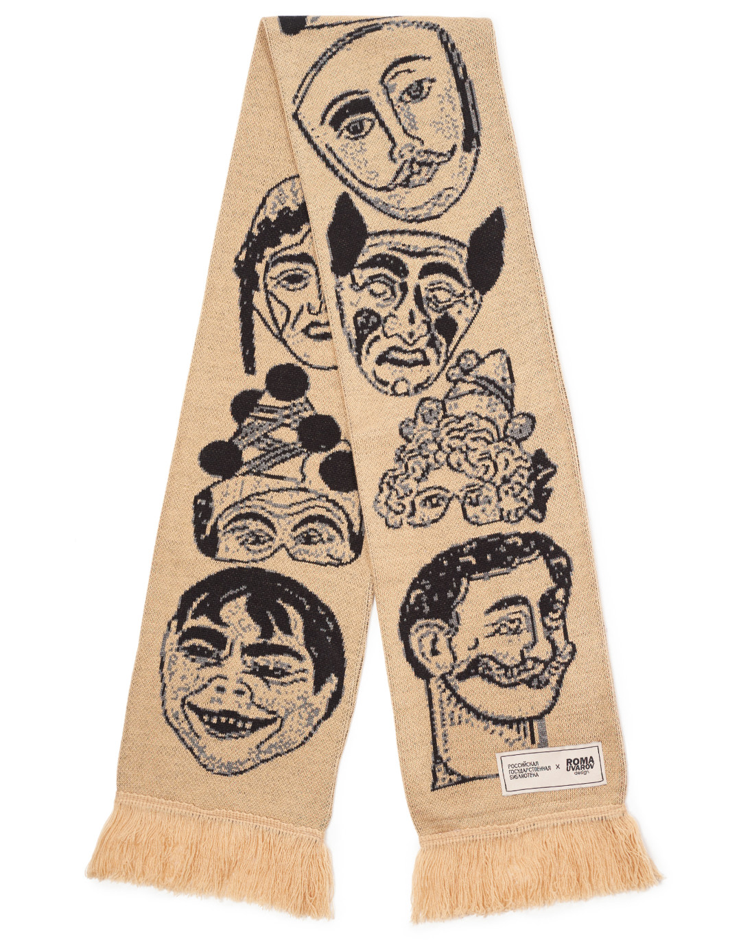 Результат погружения в визуальные коды дореволюционной эпохи — классическая картонная хлопушка с конфетти с изображением сюжета из архивного прейскуранта, упаковка для бенгальских огней — пример апсайклинга (неотъемлемой части ДНК RomaUvarovDesign) — из винтажной упаковочной бумаги, в которой в библиотеку доставляли книги и которую специально искали во всех фондах, шарф, украшенный принтом из карнавальных масок и изображениями различных персонажей, набор карнавальных масок «Сделай сам» — пример воссозданных винтажных масок с изображениями волка, тигра и совы, а также набор новогодних открыток, повторяющих дореволюционные праздничные изображения.