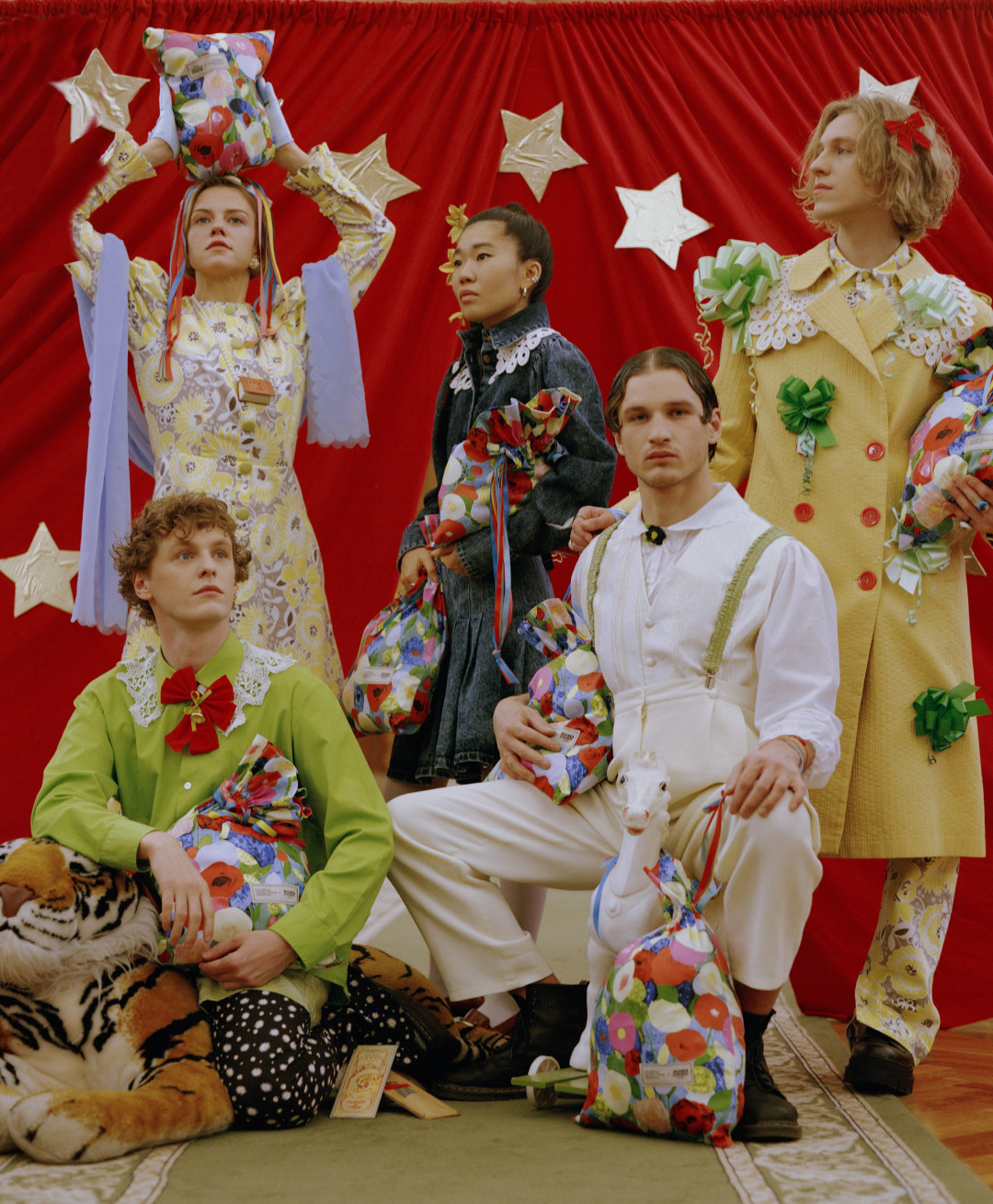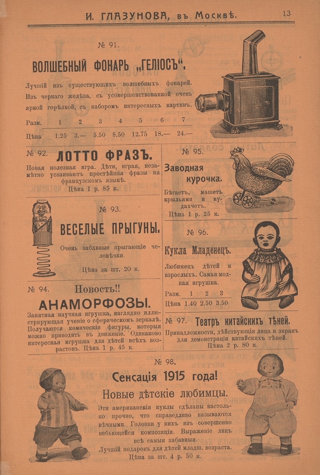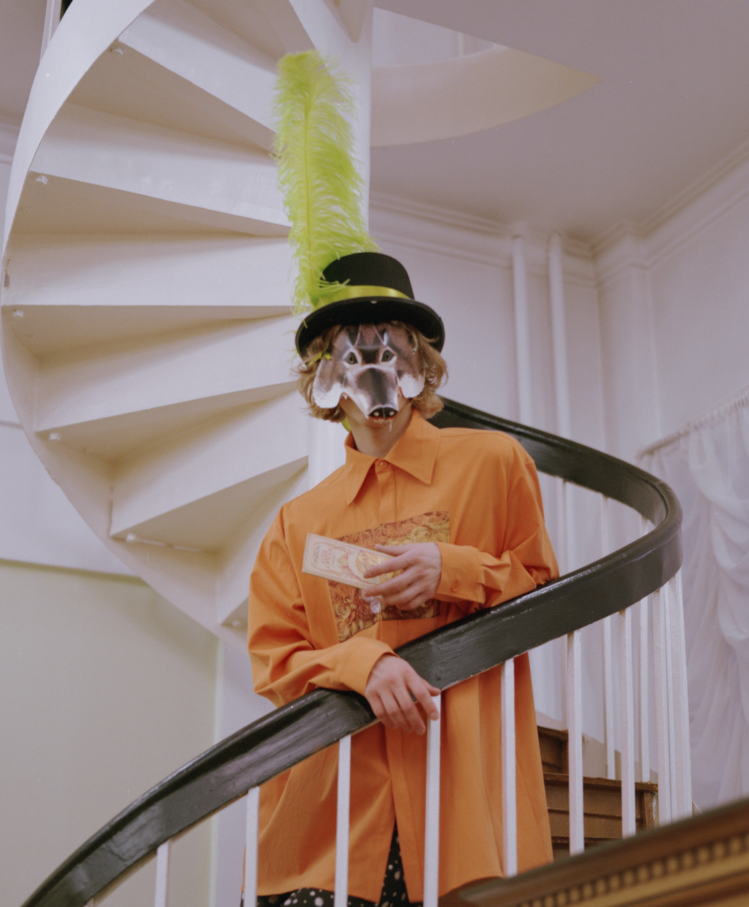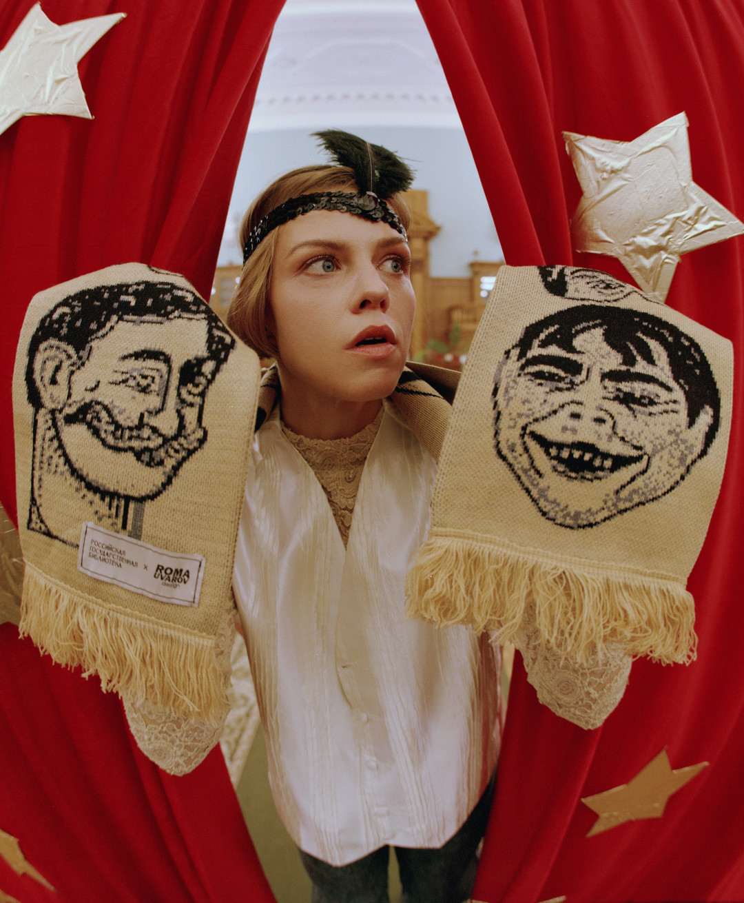 Результат погружения в визуальные коды дореволюционной эпохи — классическая картонная хлопушка с конфетти с изображением сюжета из архивного прейскуранта, упаковка для бенгальских огней — пример апсайклинга (неотъемлемой части ДНК RomaUvarovDesign) — из винтажной упаковочной бумаги, в которой в библиотеку доставляли книги и которую специально искали во всех фондах, шарф, украшенный принтом из карнавальных масок и изображениями различных персонажей, набор карнавальных масок «Сделай сам» — пример воссозданных винтажных масок с изображениями волка, тигра и совы, а также набор новогодних открыток, повторяющих дореволюционные праздничные изображения.
