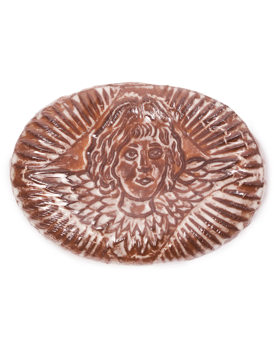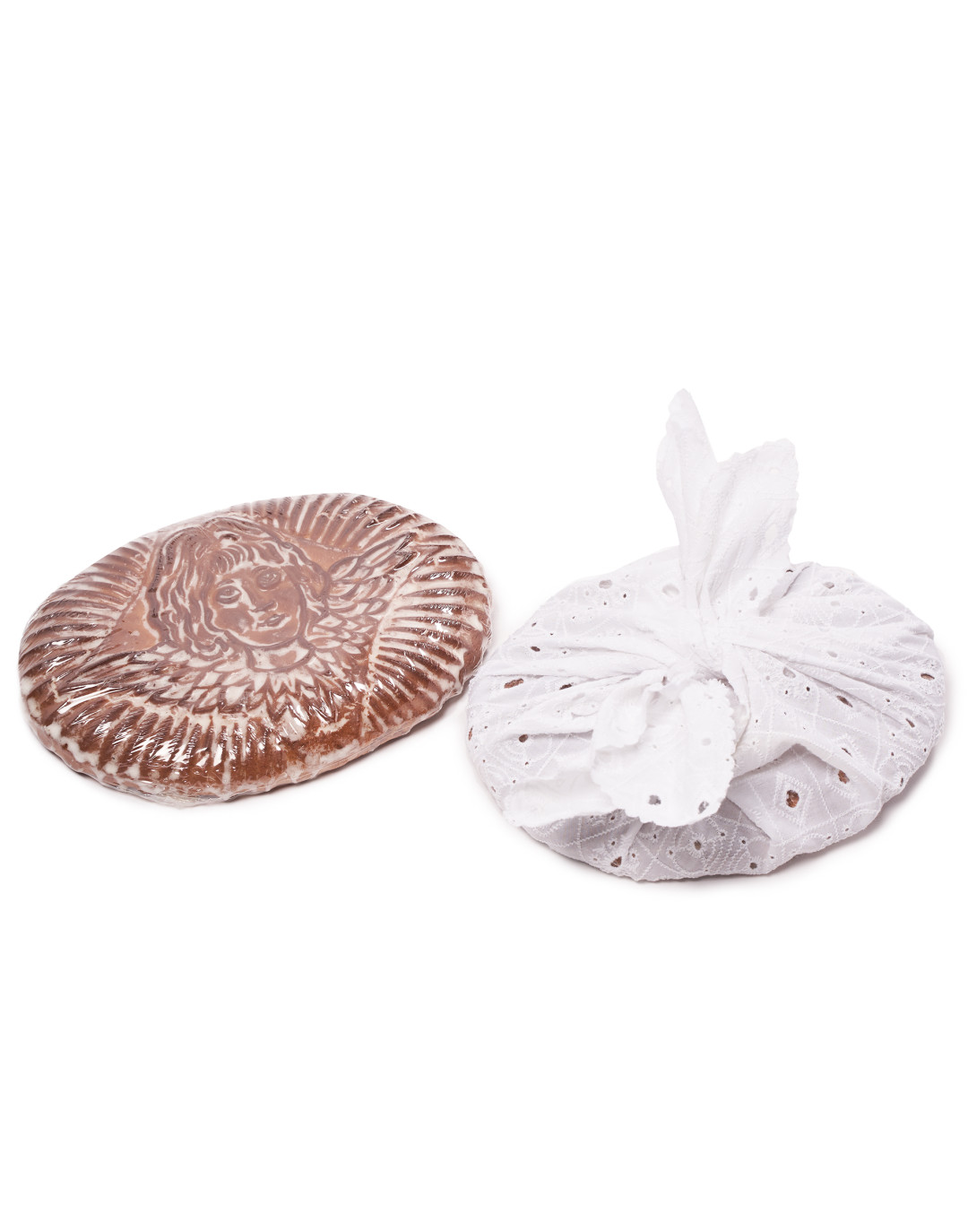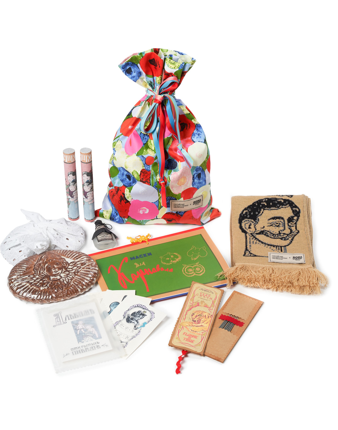 Кроме того, в сувенирном наборе есть и съедобный лот — тульский пряник «Бэ Бэ», названный в честь бумажных кукол, которые команда RomaUvarovDesign нашла в архивных журналах и альбомах для вырезания. Его создали на одной из фабрик в Туле по традиционному рецепту и украсили изображением маленького ангела, найденного на гравюрах в одной из брошюр. Бонусом: пряник завернут в ткань, в какой обычно подавали к столу пироги и хлеб.