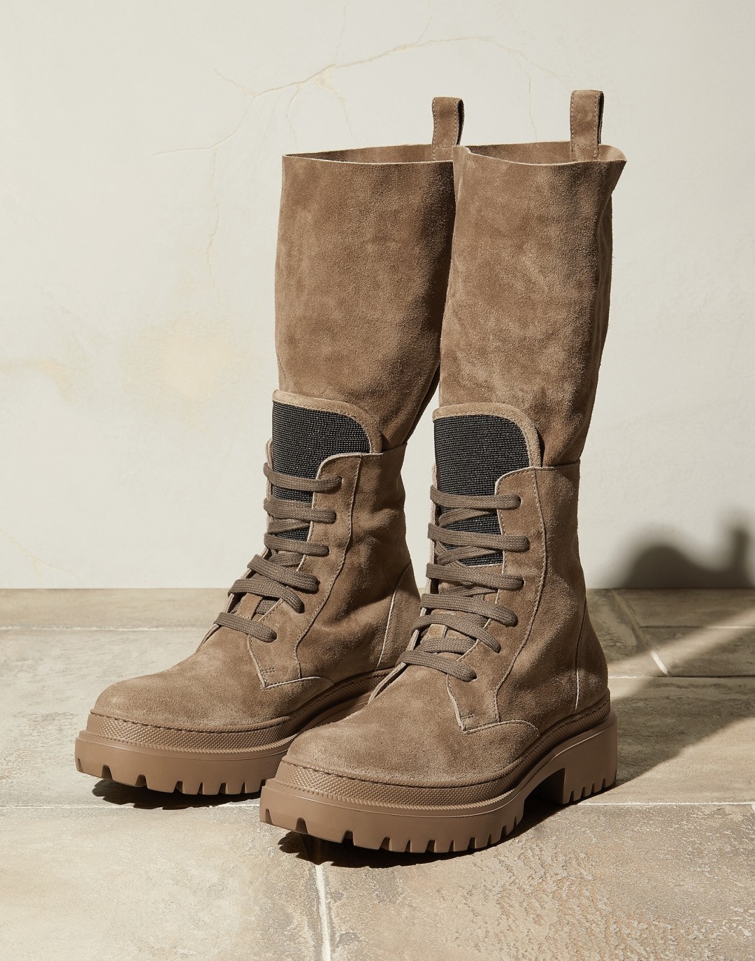 Грубые ботинки со шнуровкой Brunello Cucinelli, кажется, пытаются подрасти до ботфорт. Этот микс сапог и армейской обуви круто носить с мини-юбками. Изящная деталь — вышитый металлизированными нитями язычок!