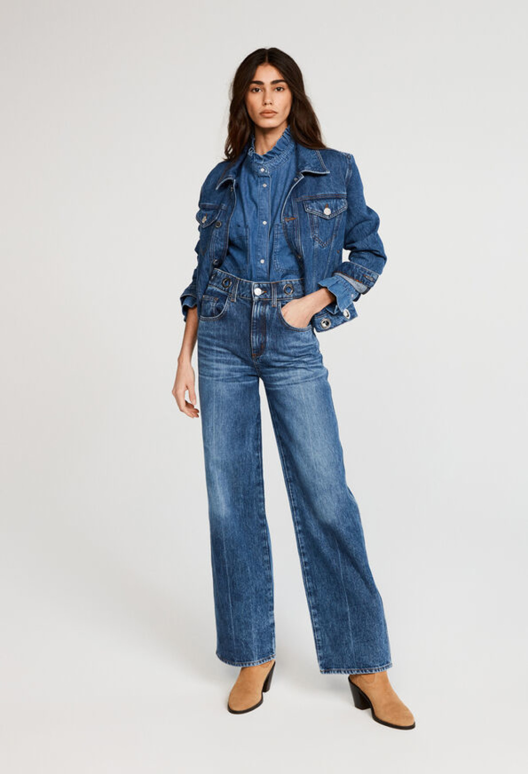 Правила деним-тотал-лука от Claudie Pierlot — это люверсы как из 1960-х на высокой талии джинсов и оверсайзовой куртке, а также подчеркнуто мужской крой рубашки с двумя нагрудными карманами. Брутально и сексуально.