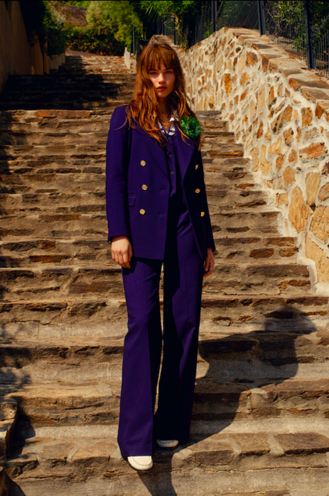 Еще одно вдохновение новой коллекции — богемные 70-ые с добавлением эстетики 90-ых. Здесь все маркеры эпох, адаптированные под современность: джинсы-клеш, двубортные костюмы, тренчи с золотыми пуговицами, комбинезоны, жакеты с бахромой и вязаные блузы с воротником.