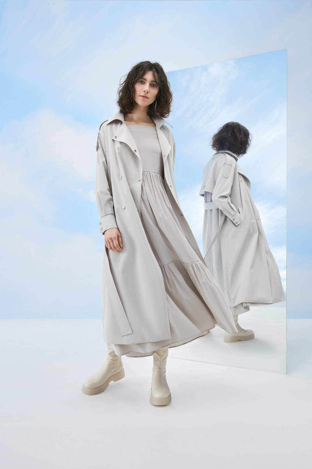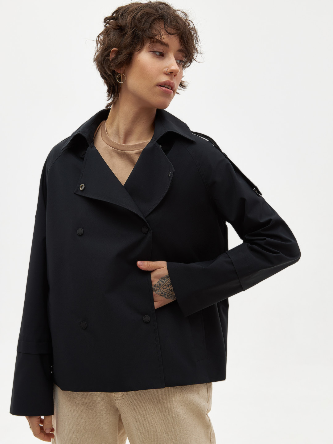 В капсульной коллекции представлены мужские и женские модели. В линейке можно увидеть классический тренч, свободную укороченную куртку в песочном и черных цветах.