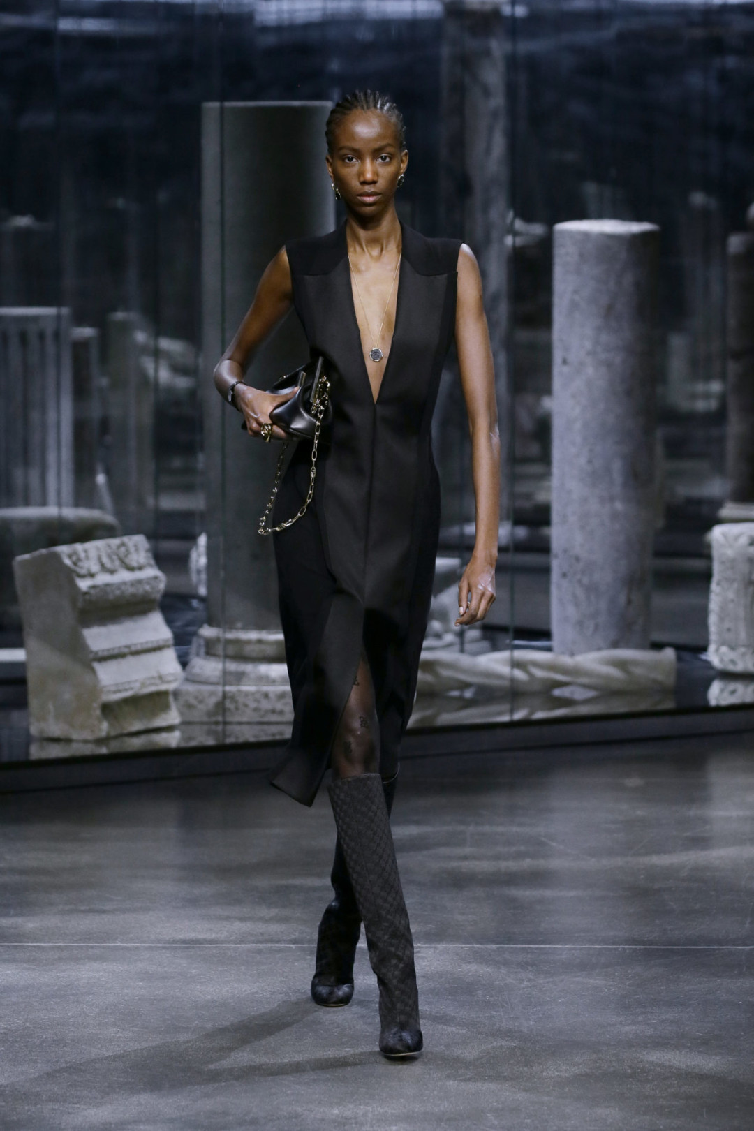 В коллекцию вошли шубы (ДНК модного дома), шорты, бра и рубашки-кроп-топы, полупрозрачные платья, объемные сумки, в том числе меховые, вязаные тотал-луки. Почти вес образы дополняли прозрачные колготки — от черных до телесных с блеском. В новой работе для Fendi Джонс вообще не использовал яркие цвета, палитра состоит из черных, коричневых, молочных, хаки и песочного оттенков.