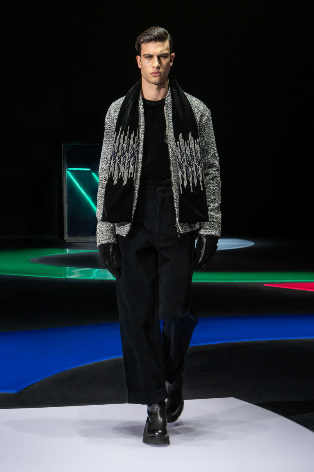 Солировали в коллекции мужские и женские костюмы: от классического силуэта (в которых вполне мог разгуливать Чак Басс из «Сплетницы») до оверсайзных с объемными брюками и пиджаками. Многие были созданы полностью из бархата. Также в коллекцию вошли дубленки, шубы, кожаные куртки, пальто, платья. Среди женских вещей было много декорированных перьями — например, жакеты и платья.
