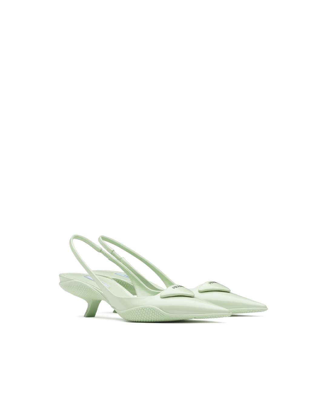 Только по одному мятному оттенку можно догадаться, что к этой паре приложил руку Раф Симонс, ведь все мы знаем его страсть к холодным цветам. В остроносые мюли из первой коллекции Рафа с Миуччей Прада зашита идея о том, как традиционные вещи трансформируются под влиянием технологий. Отсюда футуристичный стайлинг, резиновая подошва и каблук архитектурной формы. Классика? Тоже есть: треугольник с заветной надписью Prada — логотип дома.