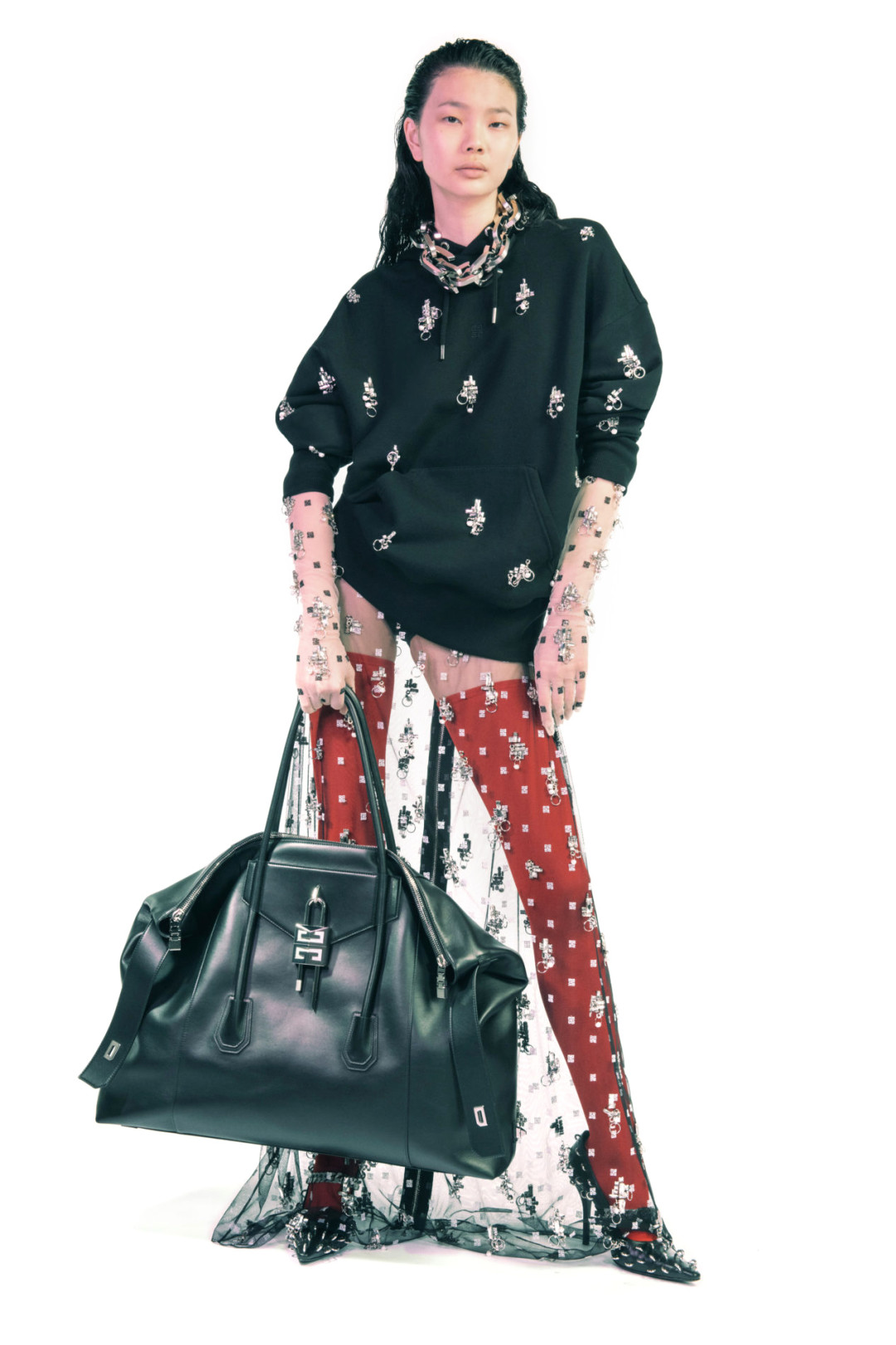 В первой коллекции Givеnchy от Мэтью Уильямса, некогда арт-директора Канье Уэста, ждали отсылок к стритвиру, но дизайнер удивил трепетным отношением к архиву. В ней есть и акцентные плечи, которые обожал Юбер де Живанши, и рога-каблуки — оммаж Александру Маккуину на посту креативного директора дома. От себя американский дизайнер добавил крупные металлические украшения: цепи-колье и замки-кулоны.