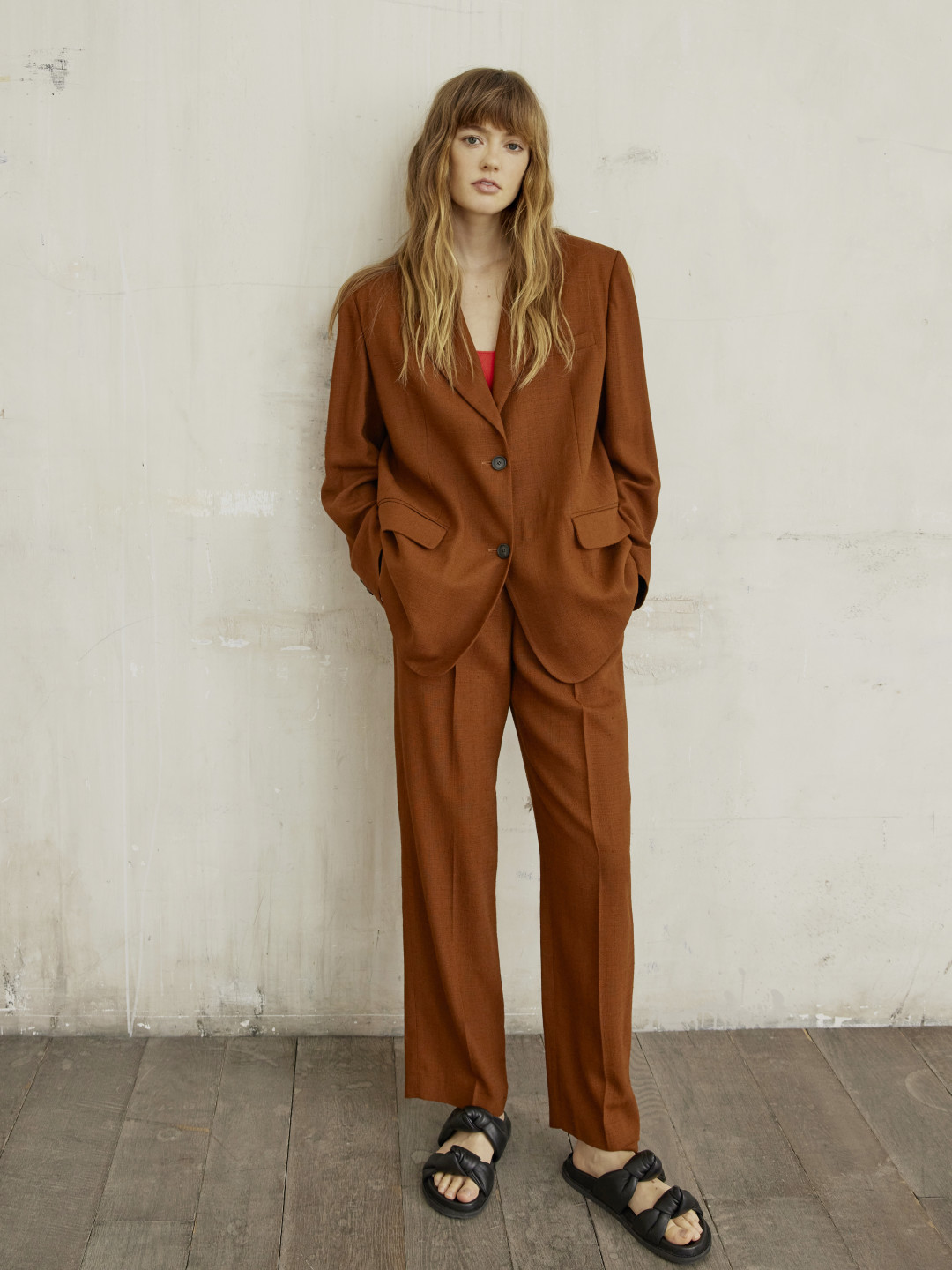 Горчичный костюм-слоуч от Claudie Perlot — находка сезона. Он должен сидеть максимально свободно, как будто вы утащили его из гардероба бойфренда. Совсем круто носить такой на голое тело.