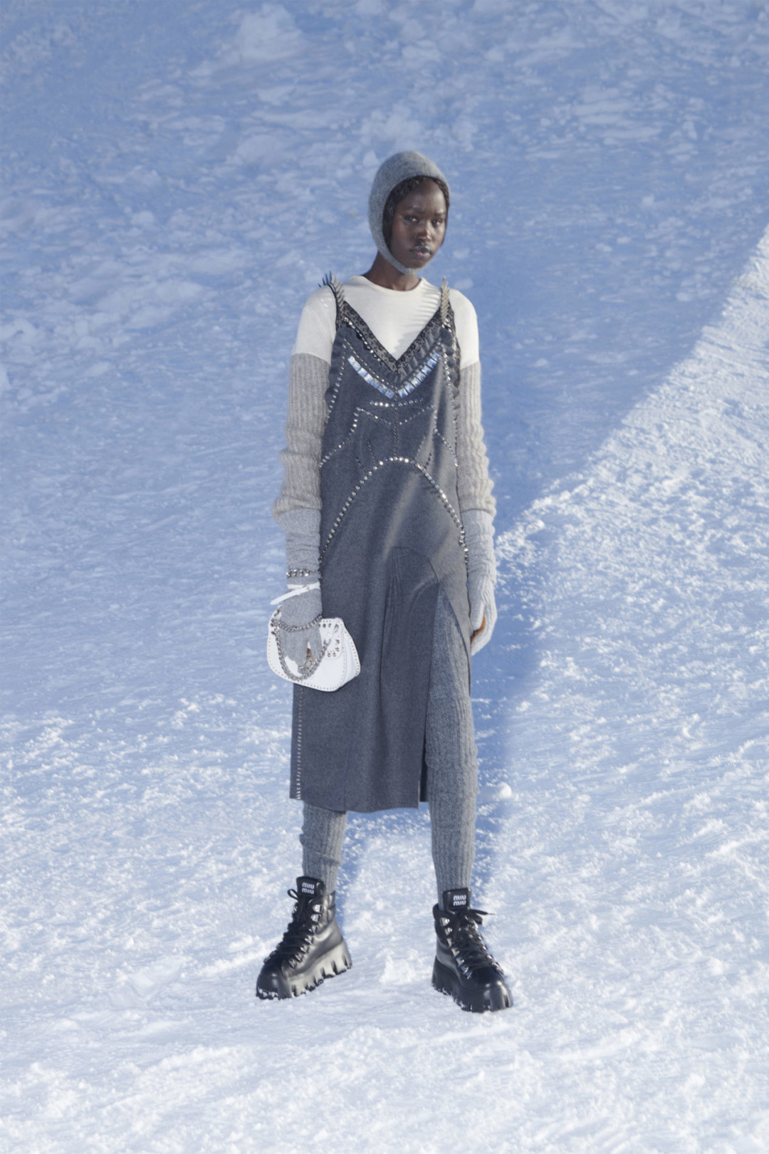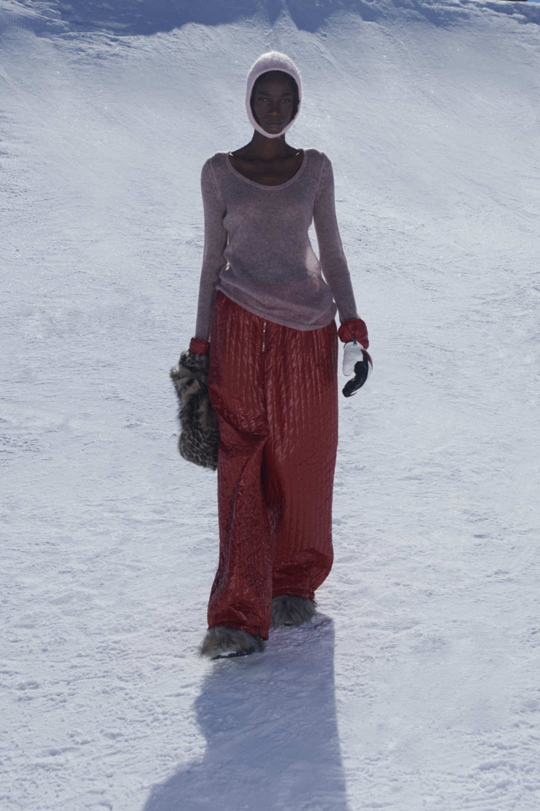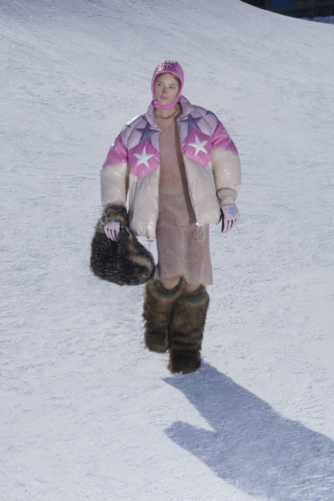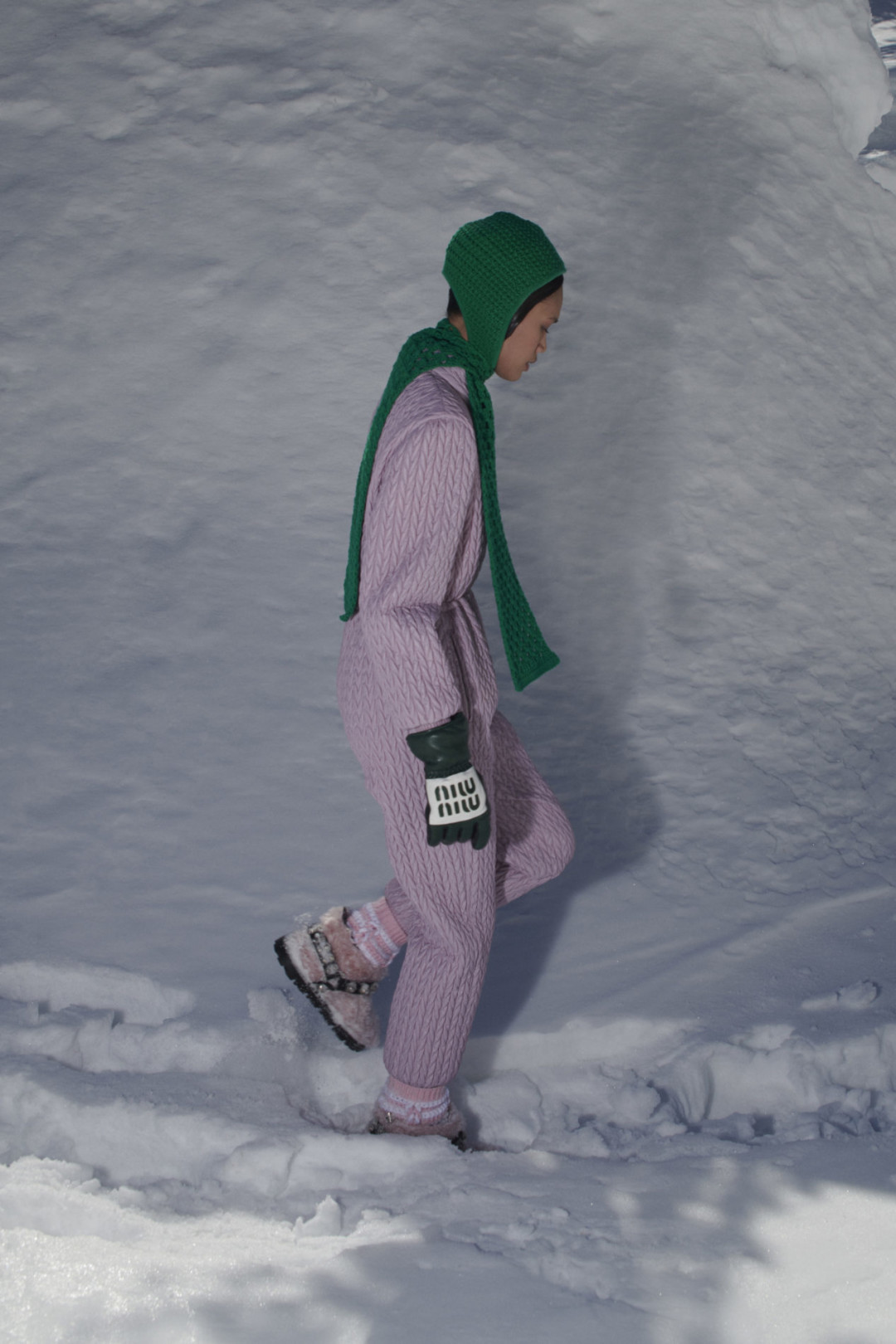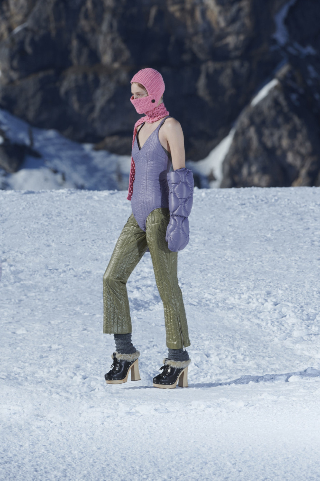 Miu Miu представили коллекцию осень-зима 2021, большая часть которой выдержана в аутдор-эстетике. Креативный директор модного дома Миучча Прада показала объемные пуховки, стеганые лыжные комбинезоны и костюмы, варежки, меховую обувь, напоминающую высокие унты, а также вязаные шапки-шлемы, дополненные масками, которые можно отстегнуть. Также в коллекцию вошли платья-комбинации, надетые поверх вязаных лонгсливов, бра и стеганые юбки. Стилизовала показ Лотта Волкова.