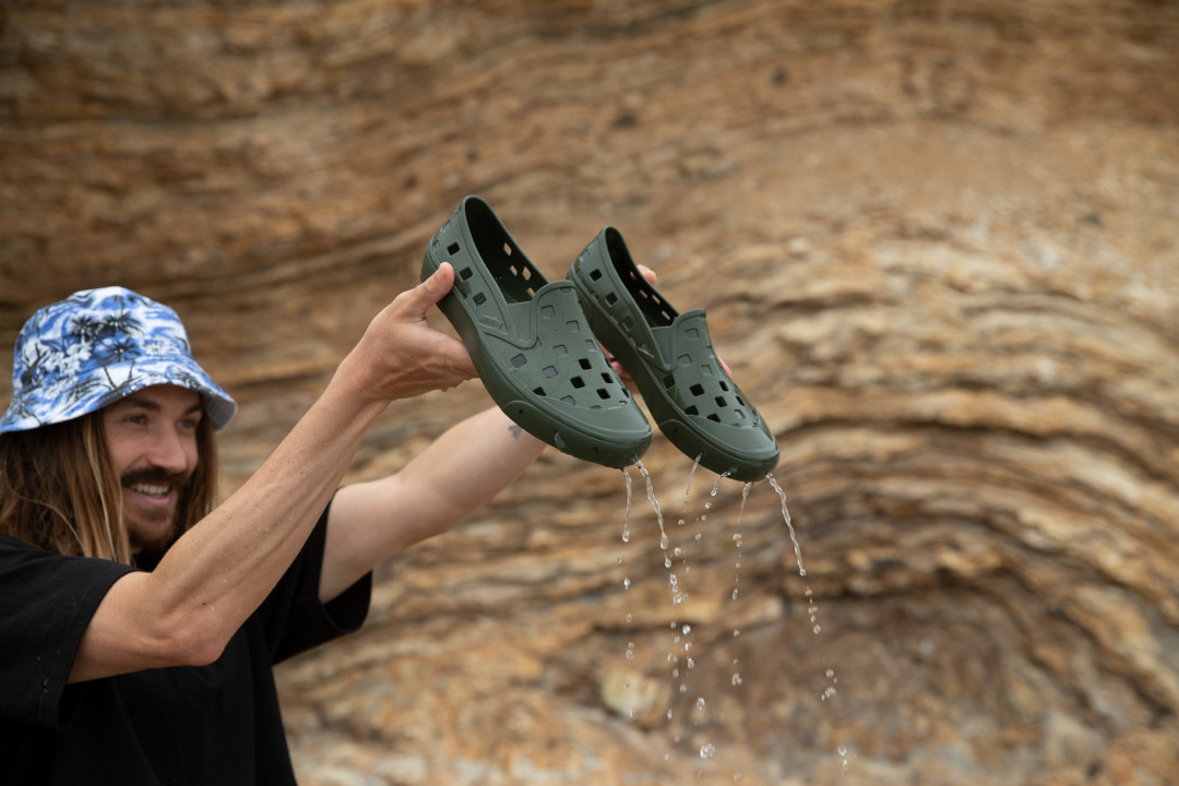 Бренд выпустил первую модель, которую можно мыть полностью — слипоны Vans Trek Slip-On. Они отлиты из термополиуретана, что снижает загрязнение окружающей среды при их производстве. Также материал, из которого сделана обувь, отлично гнется, не портится от песка, грязи или трения и быстро сохнет.