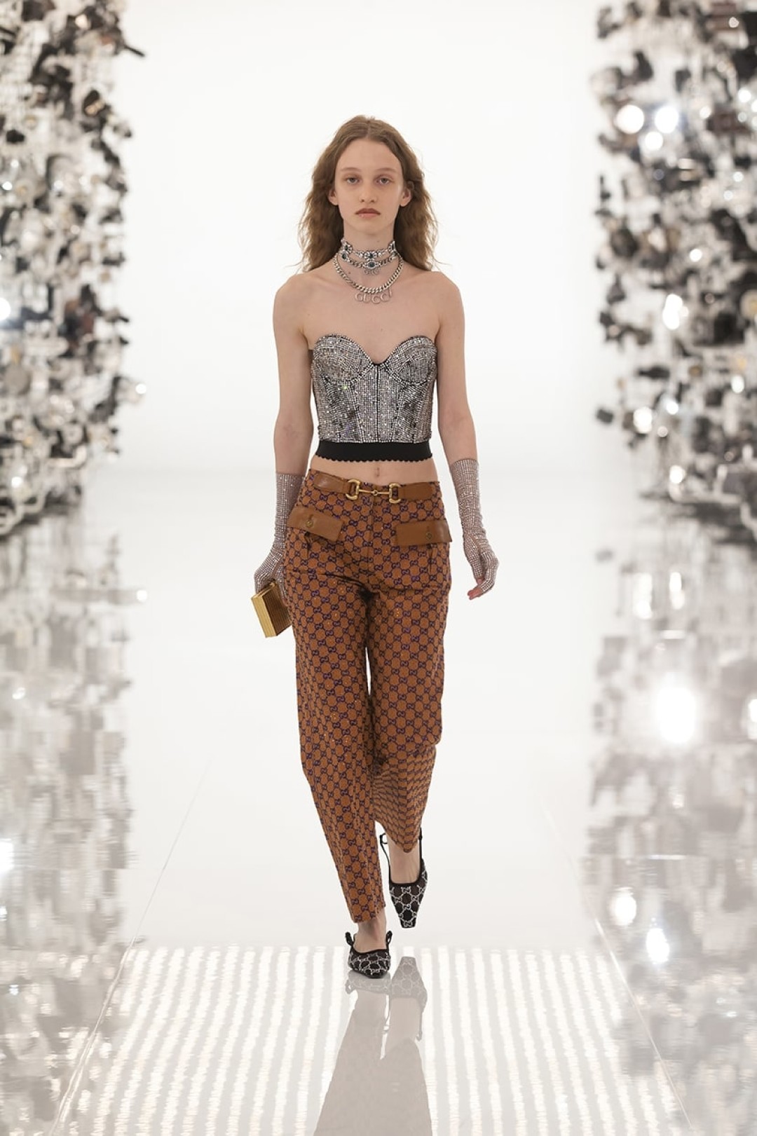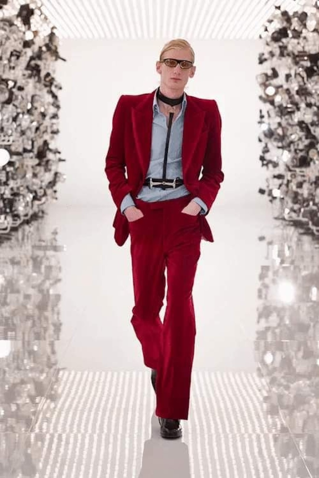 В качестве оммажа Гуччио Гуччи — жокейские аксессуары и сапоги (бренд начинал с создания атрибутов для конных прогулок), а также надпись Savoy на шлемах (основатель дома начинал свою карьеру в одноименном отеле). Отсылкой к работам Тома Форда стал красный бархатный костюм, похожий на тот, что в 1996 показал Форд. Кроме этого, в коллекцию вошли жакеты и украшения с надписями Gucci и Balenciaga, платья, кейпы, пальто и расклешенные брюки.