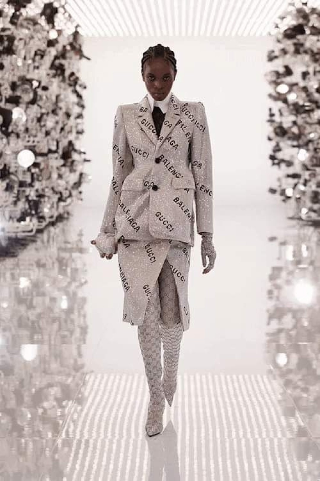Сегодня Gucci провели показ, на котором презентовали свою коллаборацию с Balenciaga. В коллекции Aria, приуроченной к столетию Gucci, объединились узнаваемые элементы обоих модных домов, например, силуэты Balenciaga и декоративность Gucci — так пиджаки с объемными плечами теперь обильно украшены пайетками. Кроме того, Алессандро Микеле обратился к архивам бренда — получился оммаж как самому основателю бренда Гуччио Гуччи, так и бывшему креативному директору модного дома — Тому Форду.